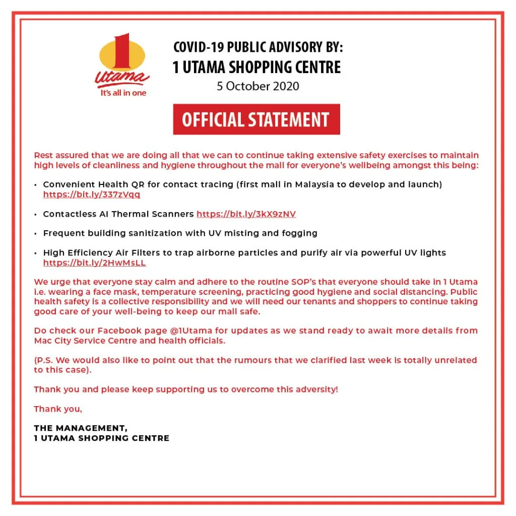 The statement urges the public to stay calm and adhere to the routine SOP’s required, such as wearing a face mask, temperature screening, practicing good hygiene and social distancing, when entering the 1 Utama Shopping Centre’s premises.