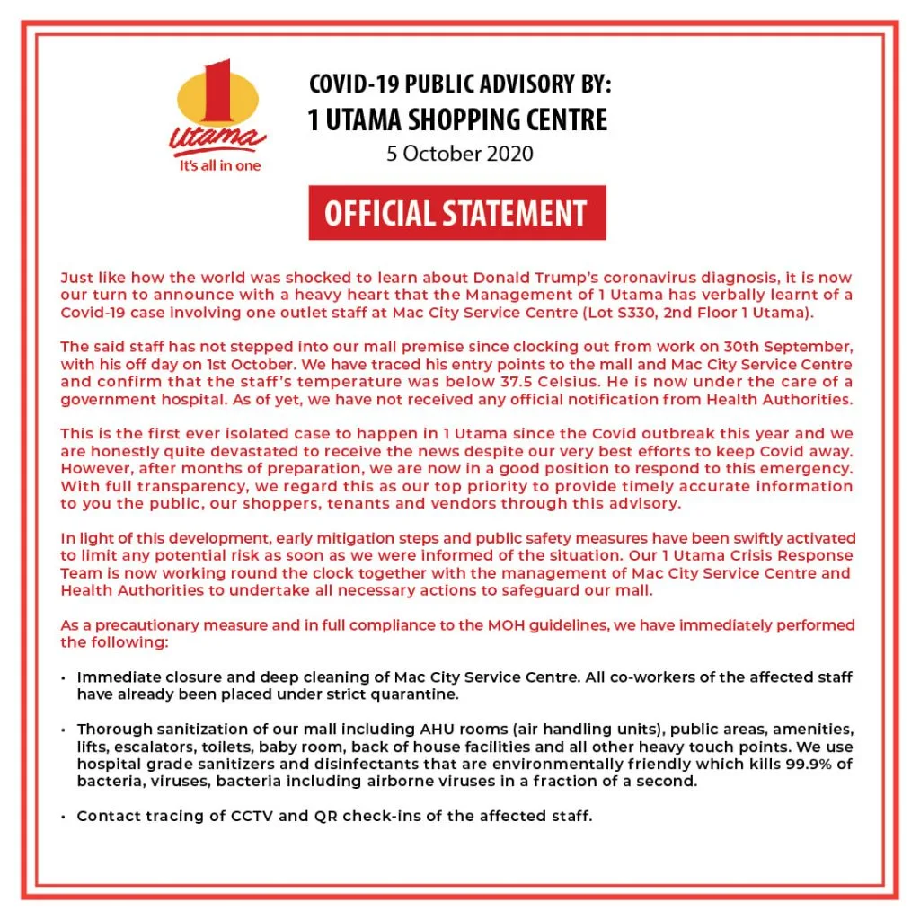 The mall released a statement today (5th October) announcing that a staff member employed at Mac City Service Center (located at Lot S330, 2nd Floor, 1 Utama) has tested positive for Covid-19.
