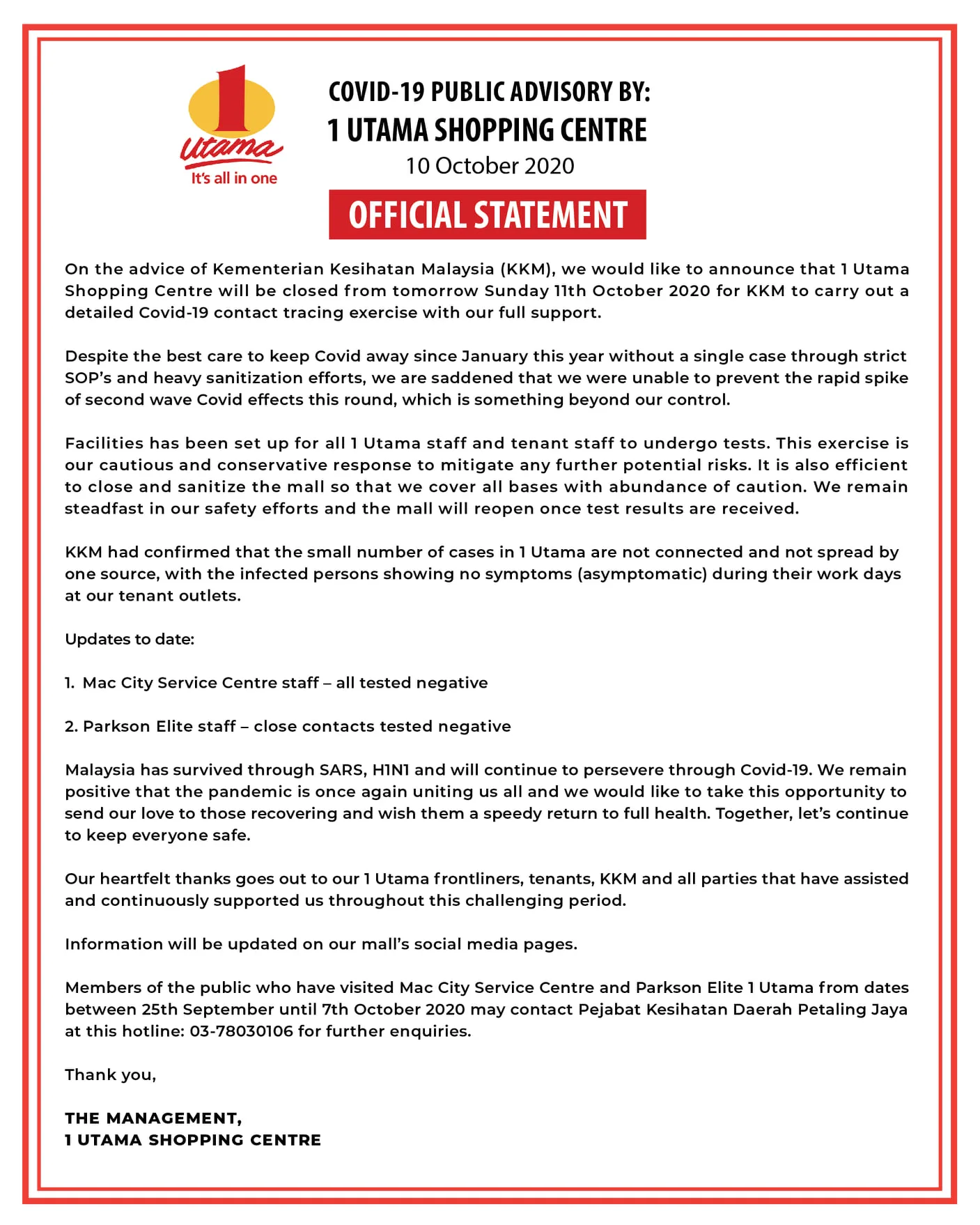 Johary Anuar revealed that there have been 2 more cases involving an employee and a shopper. “The Petaling Health Department will conduct a Covid-19 health screening at 1 Utama on 14th and 15th October starting 9am to 2pm. The priority for screening will be for close contacts who visited the premises on the above dates,” he added.