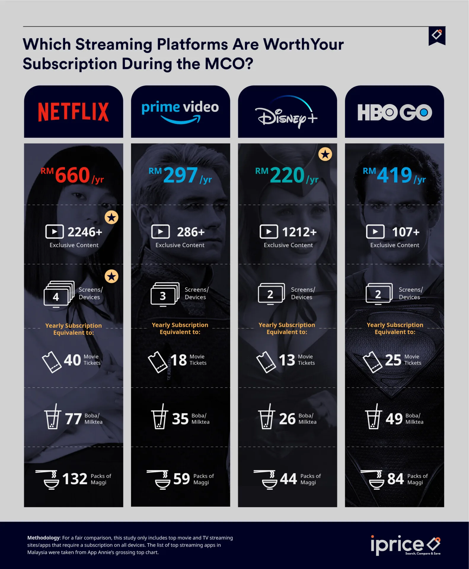 With the most titles and catalogues, Netflix premium yearly subscription costs RM660 with 4 screens you can watch simultaneously. It seems like this is the most expensive deal. According to iPrice’s research, this amount is equivalent 77 cups of boba milk tea.
