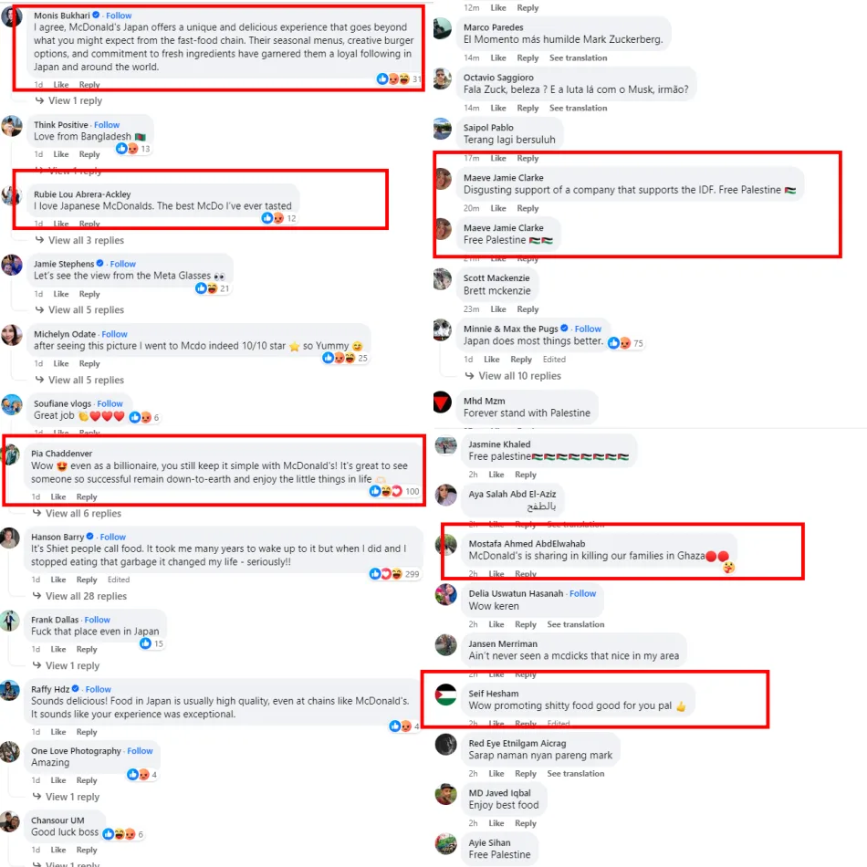 Some agreed with Mark’s statement about the food quality in Japan and even praised him for eating a simple fast food meal despite being a billionaire. Others condemned him for endorsing McDonald’s because of the ongoing boycott with many saying “Free Palestine” in the comments section.