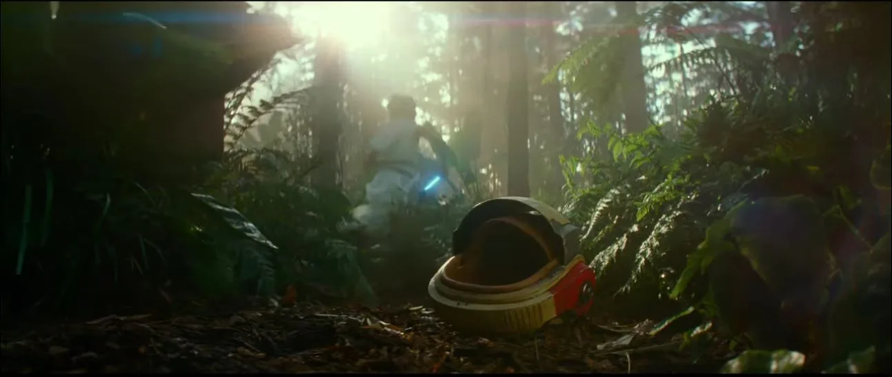 Continuing the theme set by previous trailers, it shows that Rey is still training to become a full fledge Jedi, alone in a jungle planet. The opening scene shows her running, dropping a helmet and blocking a drone’s attack. This suggests that either it’s part of the training section or that her training got cut short.