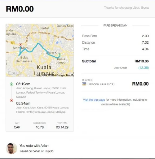 1. Uber doesn’t allow cash payment. Uber users will know that in order to use Uber, they will have to register with their credit card or debit card on the app. This method is useful to users because users won’t have to worry about not being able to get a ride when they don’t have cash on them. Also, through this method, users will get a receipt sent to their email after they’ve used the service. The receipt includes a full fare breakdown of their journey – base fare, distance and time, which allows users to understand why they’re being charged the amount they are.