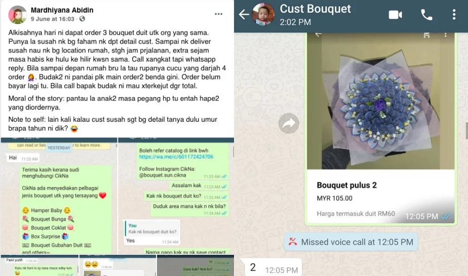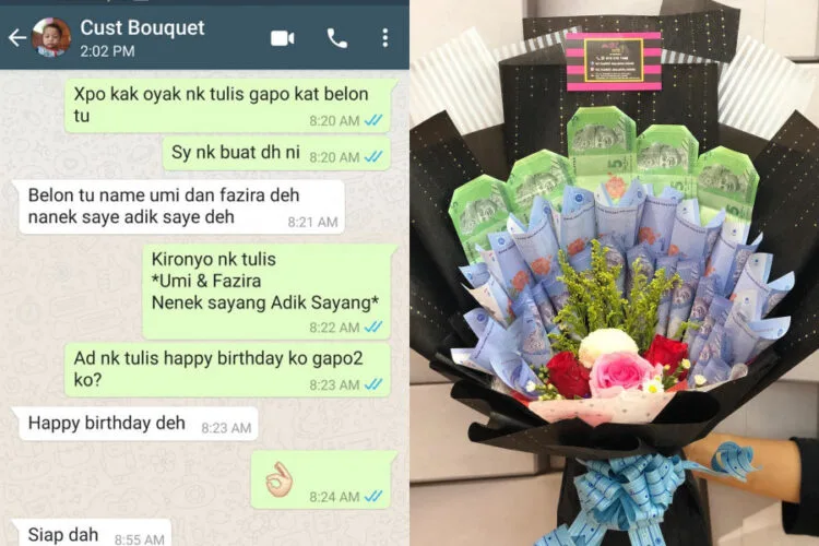 “So today, I received an order of three money bouquets for the same person. It was hard for me to make the customer understand to get his details. During the delivery time, he was hesitant in sharing his location. It took me half and hour – and an extra hour spent lurking around the same area (Pasir Putih),” Mardhiyana shared. “I even tried to call the customer, but to no avail.”