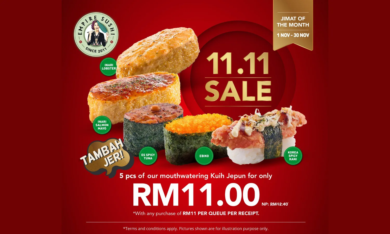 Calling all sushi lovers! Empire Sushi is back with an irresistible 11.11 sale that lasts the whole month of November! With their ‘TambahJer’ promotion, sushi lovers can get 5 pieces of mouthwatering ‘Kuih Jepun’ for only RM11 per queue per receipt.