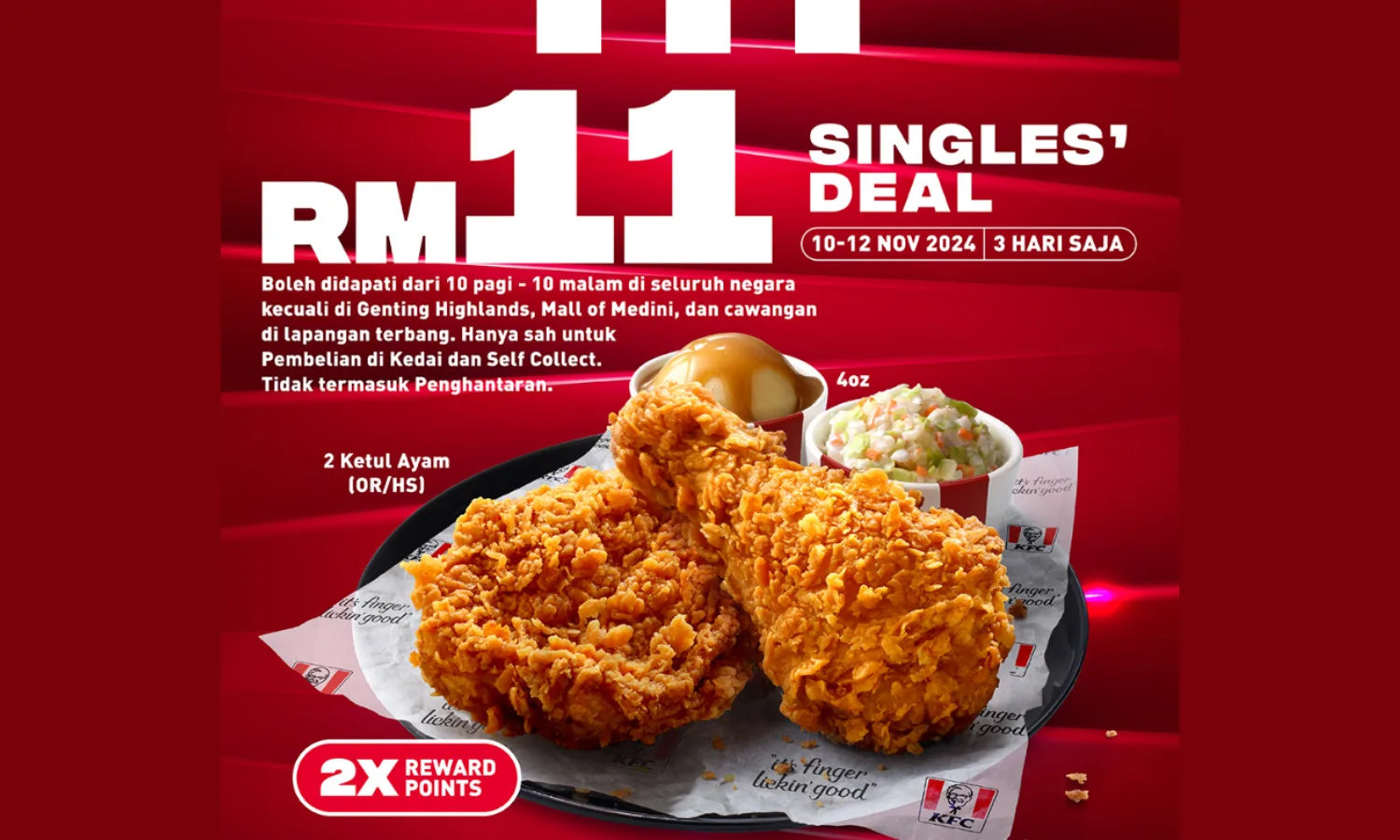KFC is back again with another irresistible deal! In this 11.11 promotion, KFC is bringing an exciting Singles’ Day deal with an alluring offer that will make it hard to say ‘NO’. Perfect to satisfy your cravings, the 11.11 deal includes 2 pieces of KFC chicken, 4 oz of whipped potato, and coleslaw, all for only RM11! Those who purchase through the KFC Self Collect orders via the KFC app are eligible for 2x Reward Points, increasing the value of your meal. This deal is only available from the 10th to the 12th of November, so don’t miss out and get your share now!