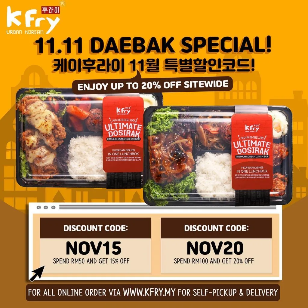 K Fry Urban Korean is giving out discount codes for their Ultimate Dosirak lunch boxes. All purchases worth RM50 to RM100 on their website can now get up to 20% off sitewide. This 11.11 offer is valid only for takeaway and delivery orders.