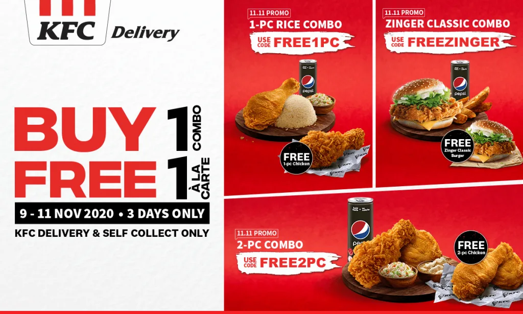 Of course we need to celebrate all these amazing 11.11 deals with some yummy food! That’s exactly why KFC is giving us the chance to treat ourselves to their Buy 1 Free 1 combo meals. For orders worth a minimum of RM15, customers can now use the promo codes listed above to receive an extra dish with their selected meals. Wow, more food for the same price? Sounds finger licking good!