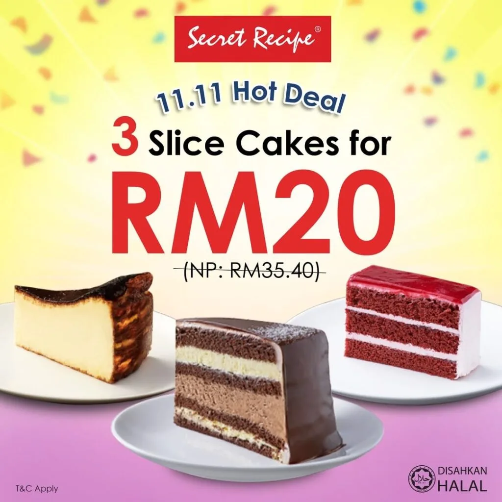 Feel like getting something sweet after the savory food you’ve had? Here’s a Secret Recipe cake voucher up for grabs for you! Grab the voucher on the 11th November and you can get 3 slices of cakes for only RM20 altogether.
