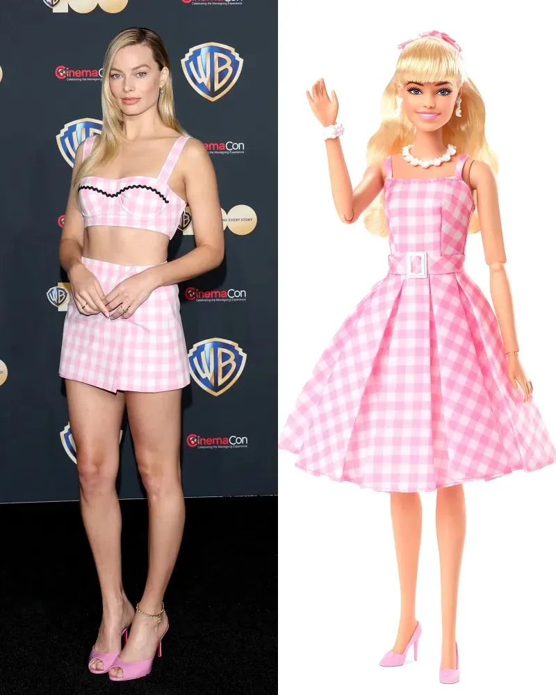 Fans became aware of a few allusions to The Wizard of Oz after the Barbie movie trailer debuted in May, notably Barbie’s pink belted gingham outfit. Is Barbie’s appearance a reference to Dorothy’s well-known blue gingham frock, or is it just a coincidence? Robbie displayed the timeless checkered pattern on several occasions during the press tour, including a two-piece Prada bra and miniskirt combination and a vintage Chanel blazer, in addition to costumes from the film.