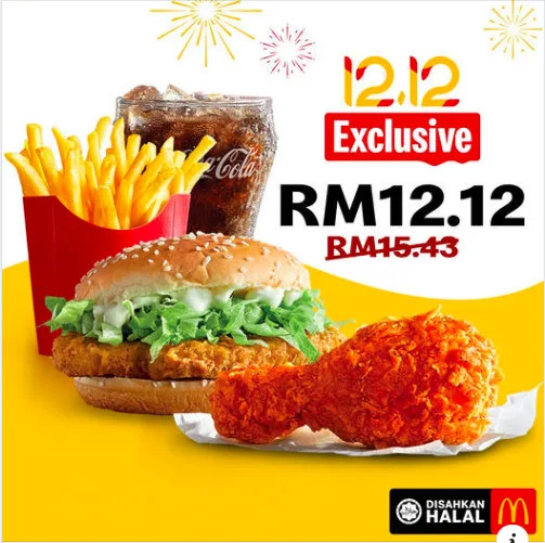 Redeem this McD App exclusive deal for McChicken (M) McValue Meal with 1pc Ayam Goreng McD for just RM12.12. Offer valid on 12th Dec 2021 from 10am onwards.
