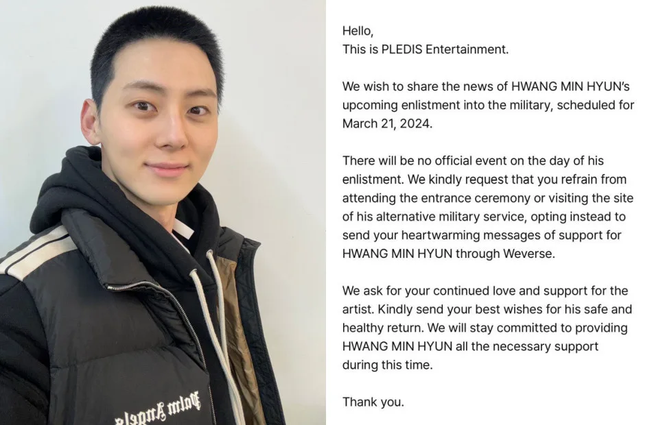 NU’EST member Hwang Min-hyun (황민현) began his mandatory military enlistment on the 21st of March 2024. PLEDIS Entertainment issued an official statement via Weverse.