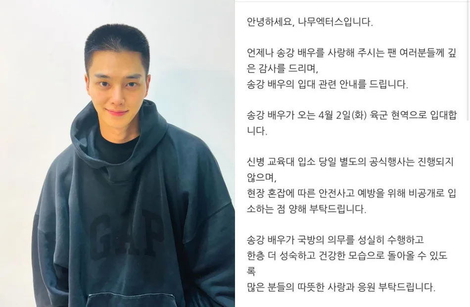 Song Kang (송강) agency released an official statement confirming his mandatory military enlistment. In their statement, Namoo Actors, Song Kang’s agency, expressed deep gratitude to the fans who consistently show love for the actor.
