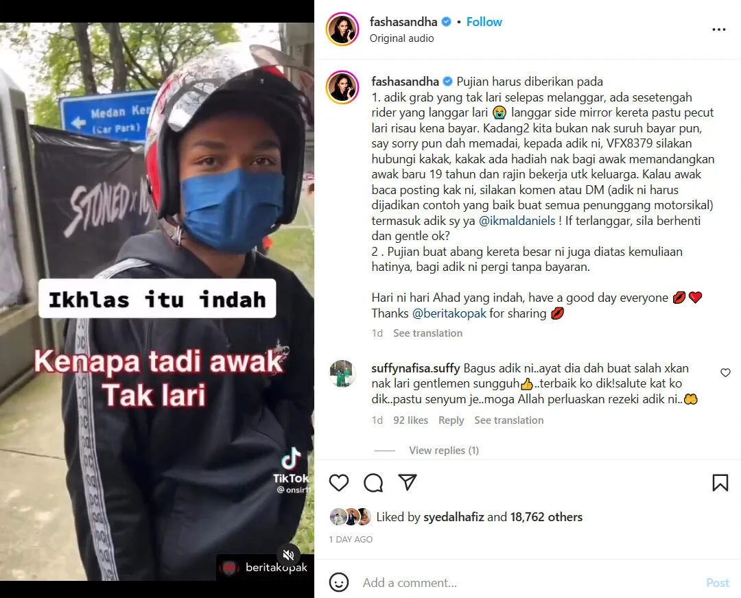 Scrolling through the comments section, many netizens applauded Andrew for his kind gesture towards the young deliveryman. This also caught the attention of actress Fasha Sandha. Through a post on her Instagram, she expressed her intention of buying a gift for the delivery rider. “If you’re reading this, please comment or drop a DM on my page (this little brother should be a good example for fellow motorcyclists on the road),” the “Natasha” star said.