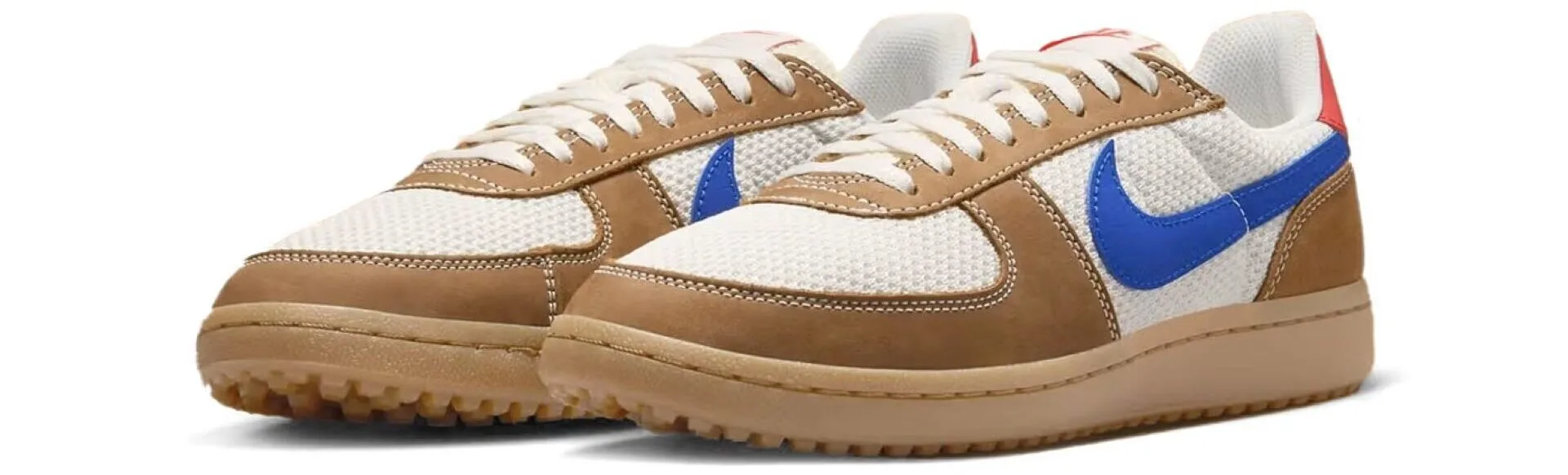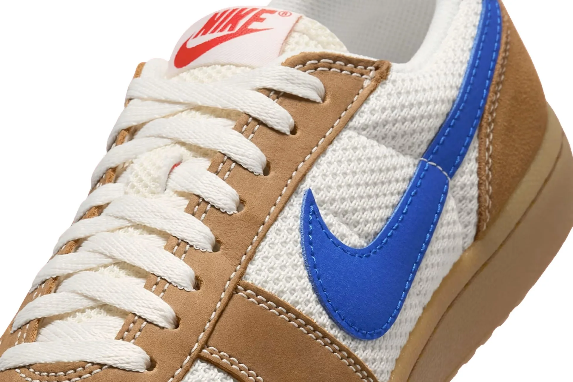 The shoe features a cream mesh base paired with light brown suede overlays, creating a clean yet rugged look. A bold blue leather Swoosh cuts across the sides, while red accents on the heel and tongue add just the right amount of contrast.
