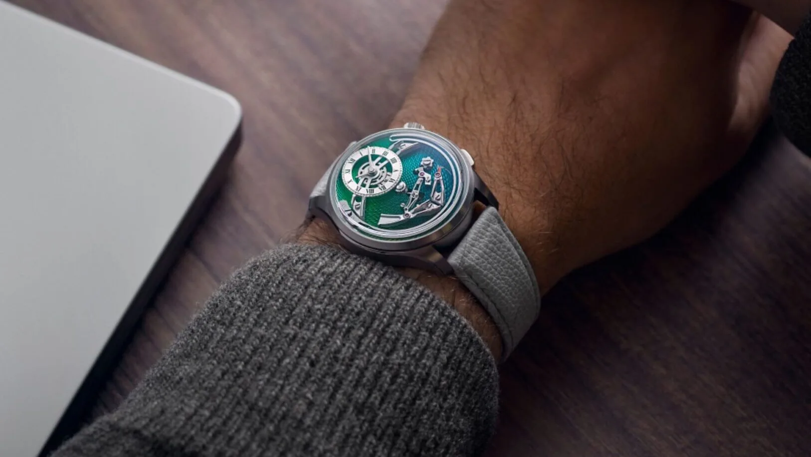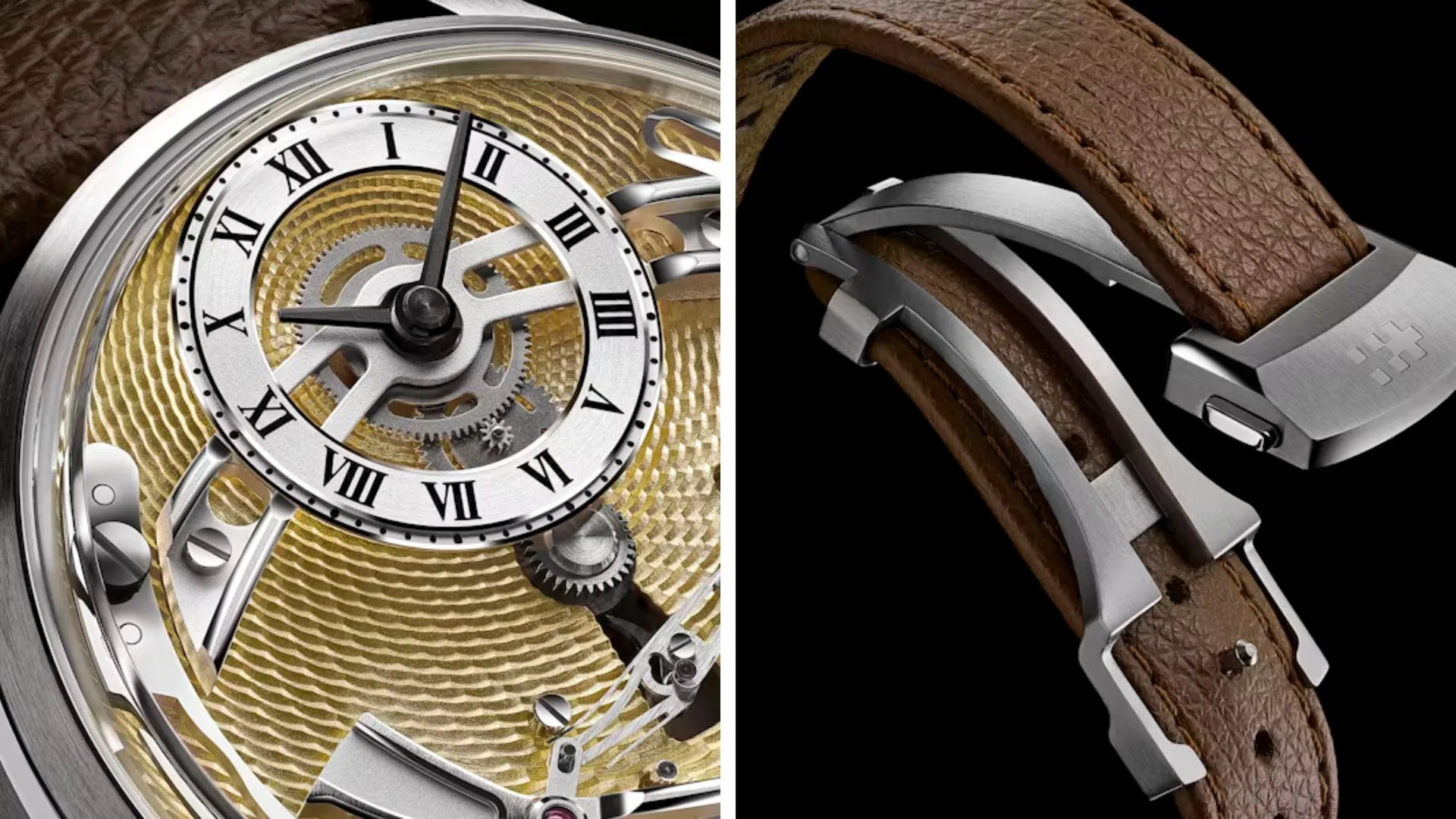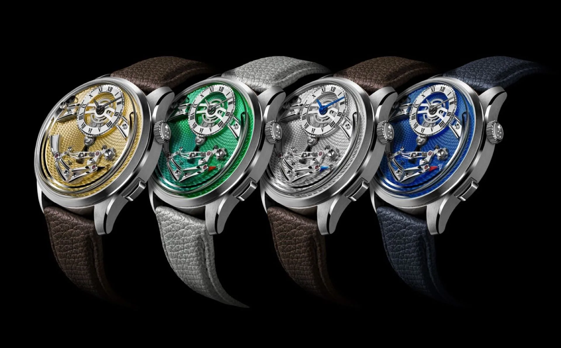 The watch boasts a sophisticated laser-etched guilloché pattern, giving it a tactile and visual appeal that complements its mechanical innovation. The dial, available in gold, green, silver, and blue, has a timeless feel, especially with the newly added Roman numerals on the 12 o’clock subdial, enhancing its classic design.
