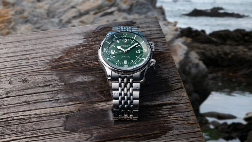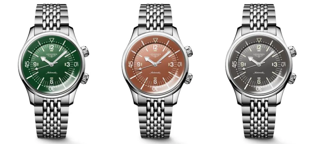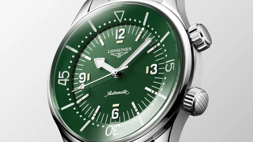At first glance, it is distinctive because of its two crowns and internal rotating bezel. Presented in 2023 in a completely redesigned version measuring 39 mm in diameter, this year the Longines Legend Diver collection comes with new polished lacquered dials in green, terracotta, and anthracite grey.