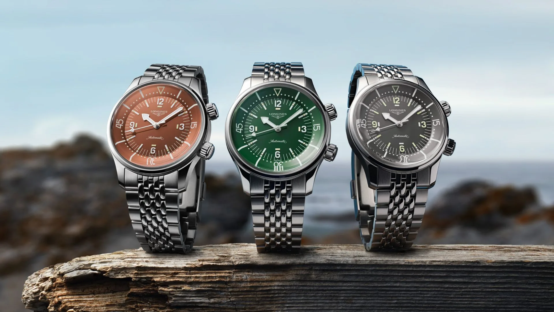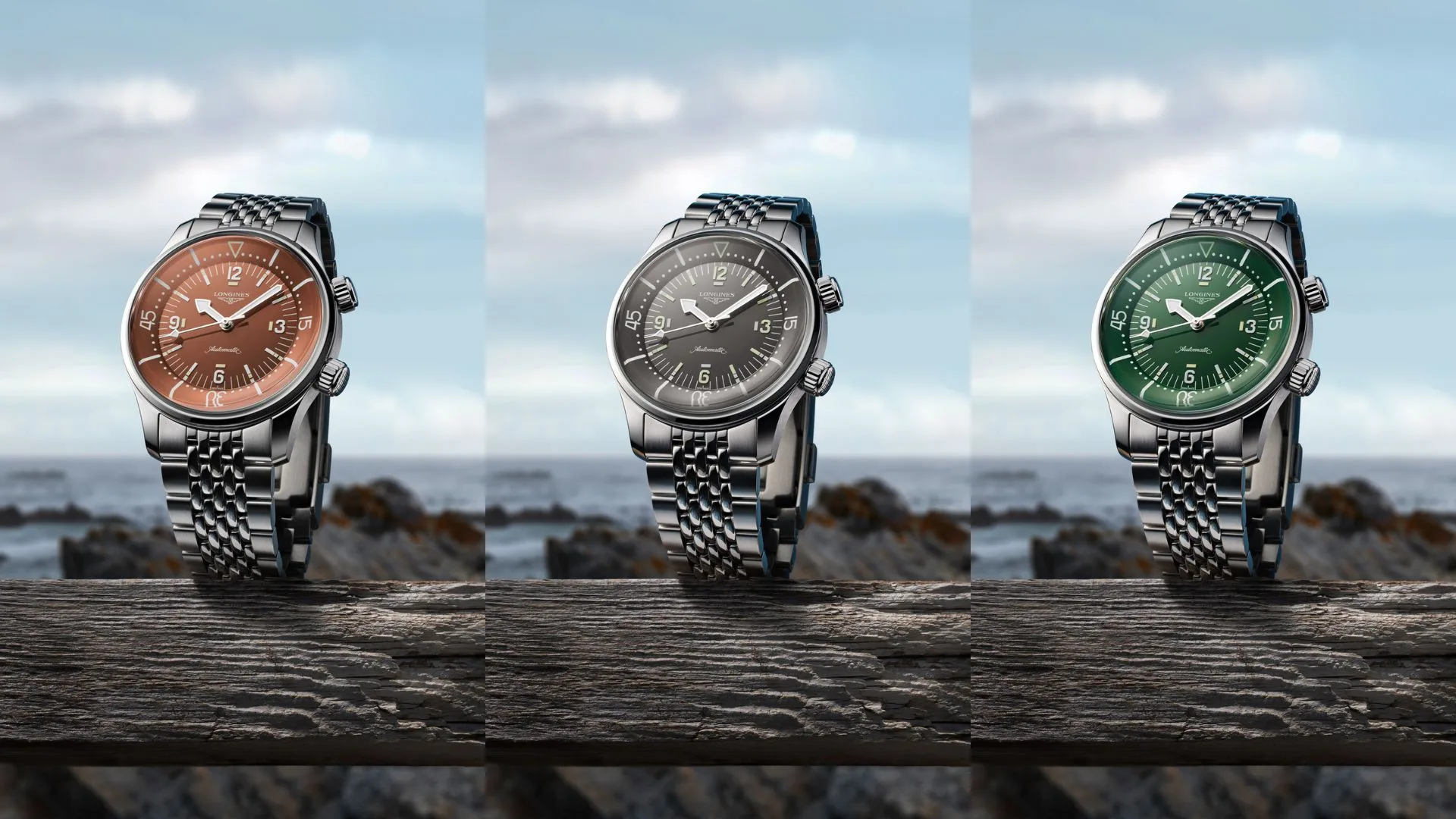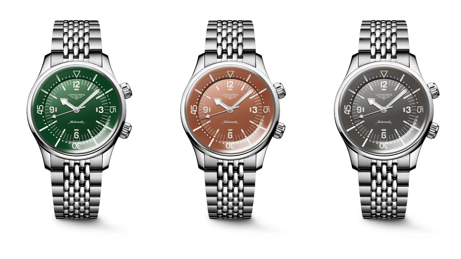 At first glance, it is distinctive because of its two crowns and internal rotating bezel. Presented in 2023 in a completely redesigned version measuring 39 mm in diameter, this year the Longines Legend Diver collection comes with new polished lacquered dials in green, terracotta, and anthracite grey.