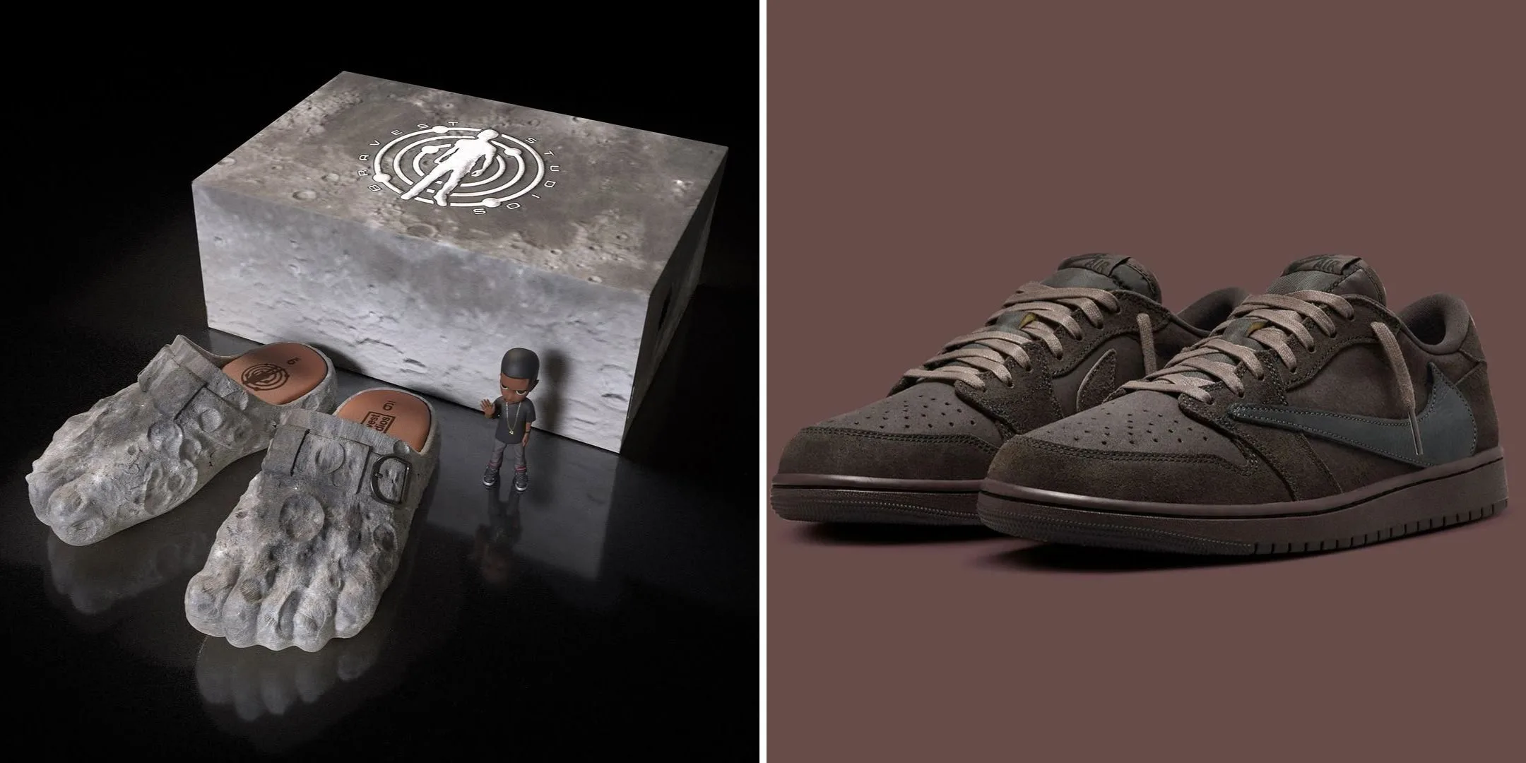 The Bravest Studios x Kid Cudi Moon Clog rocks a space-inspired design with textured gray, orange insoles, and a collector’s box, while the Travis Scott x Air Jordan 1 Low ‘Velvet Brown’ blends luxury suede, a flipped Swoosh, and bold red accents. These collaborations are packed with unique style and features – don’t miss out!