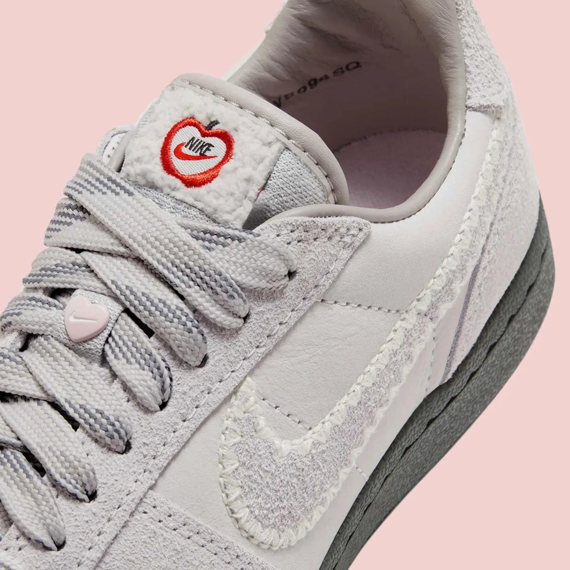 The most heart-stealing detail? The tongue tag and insoles, which proudly declare, “You Are The Apple Of My Eye” – a sweet touch complemented by red apple graphics with heart-shaped cutouts. A dainty pink heart charm dangles from the laces, adding a little extra romance to the mix. Speaking of laces, Nike swaps out the standard setup for wide, multicolour laces in rich purple tones, bringing a dreamy, playful feel to the silhouette.