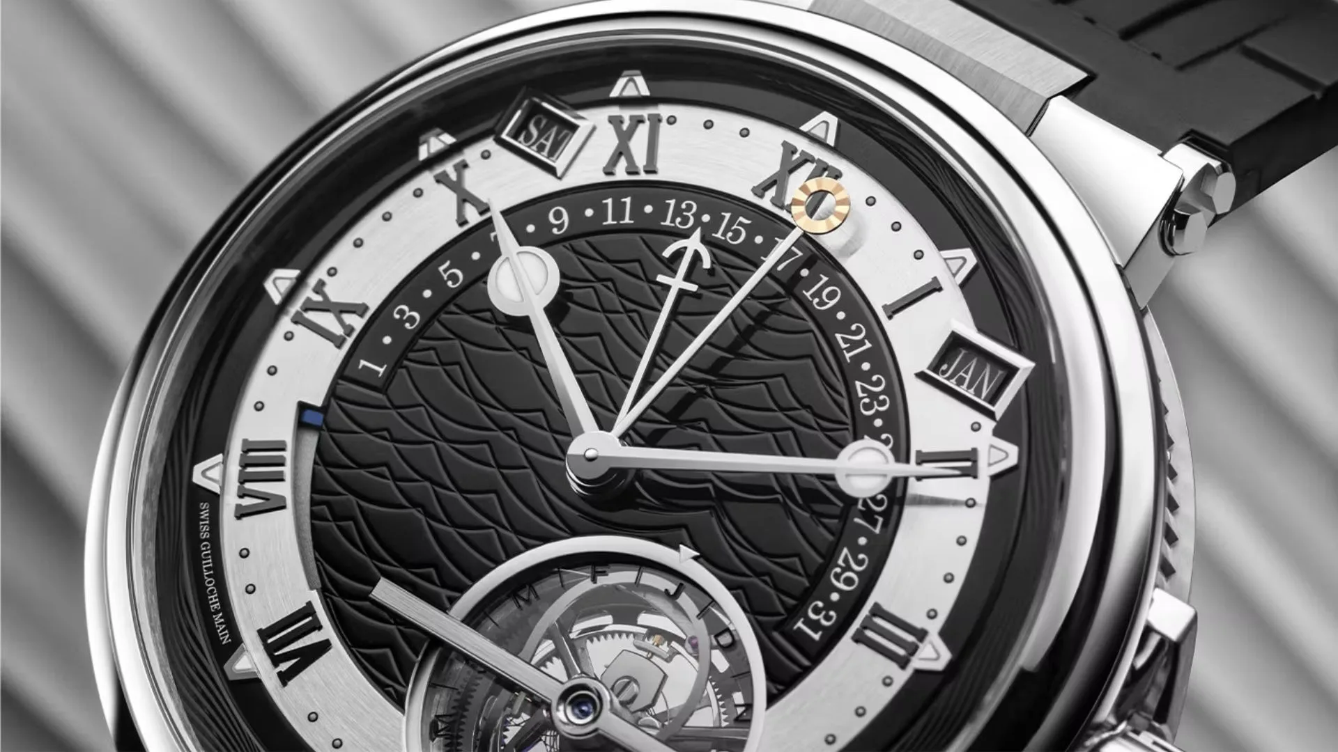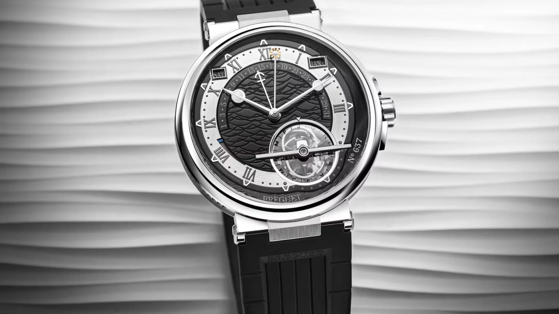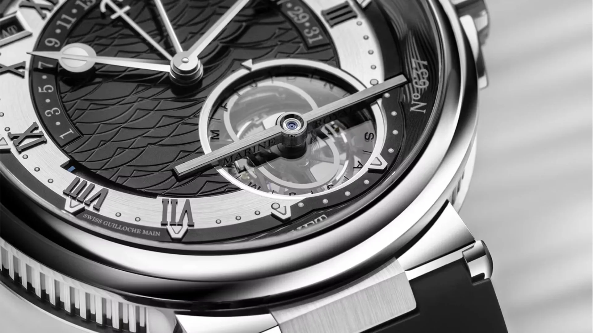Presenting the Marine Tourbillon Équation Marchante 5887! This elegant timepiece comes in a 44mm case made of refined platinum. This shimmering metal pairs nicely with its black dial, whose very face has been hand-guillochéd by master artisans.