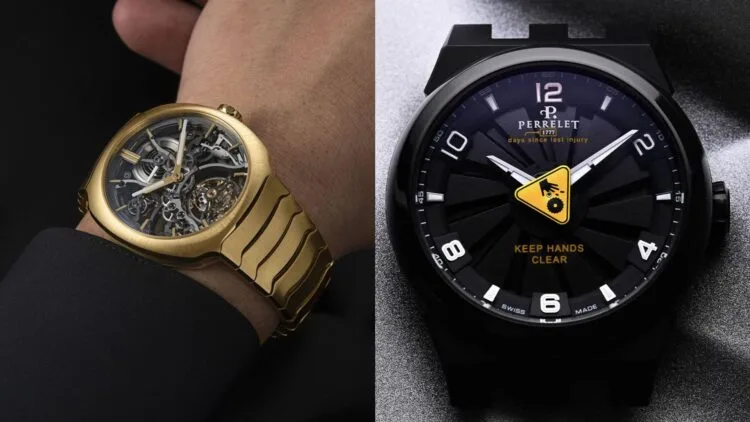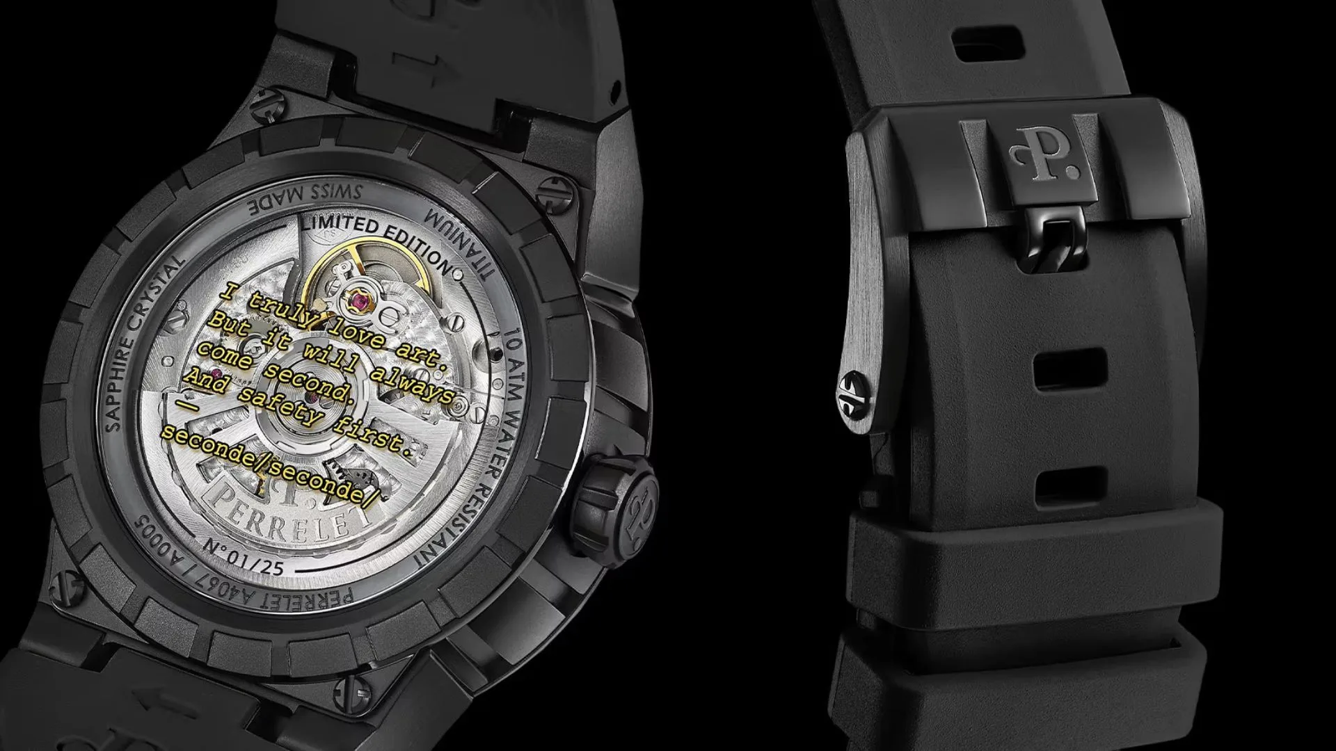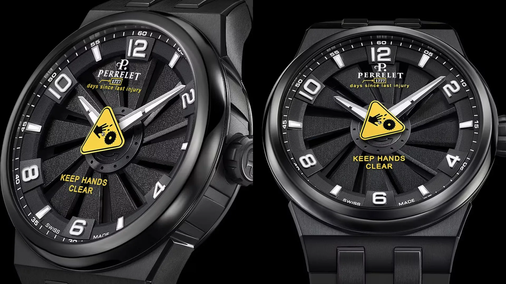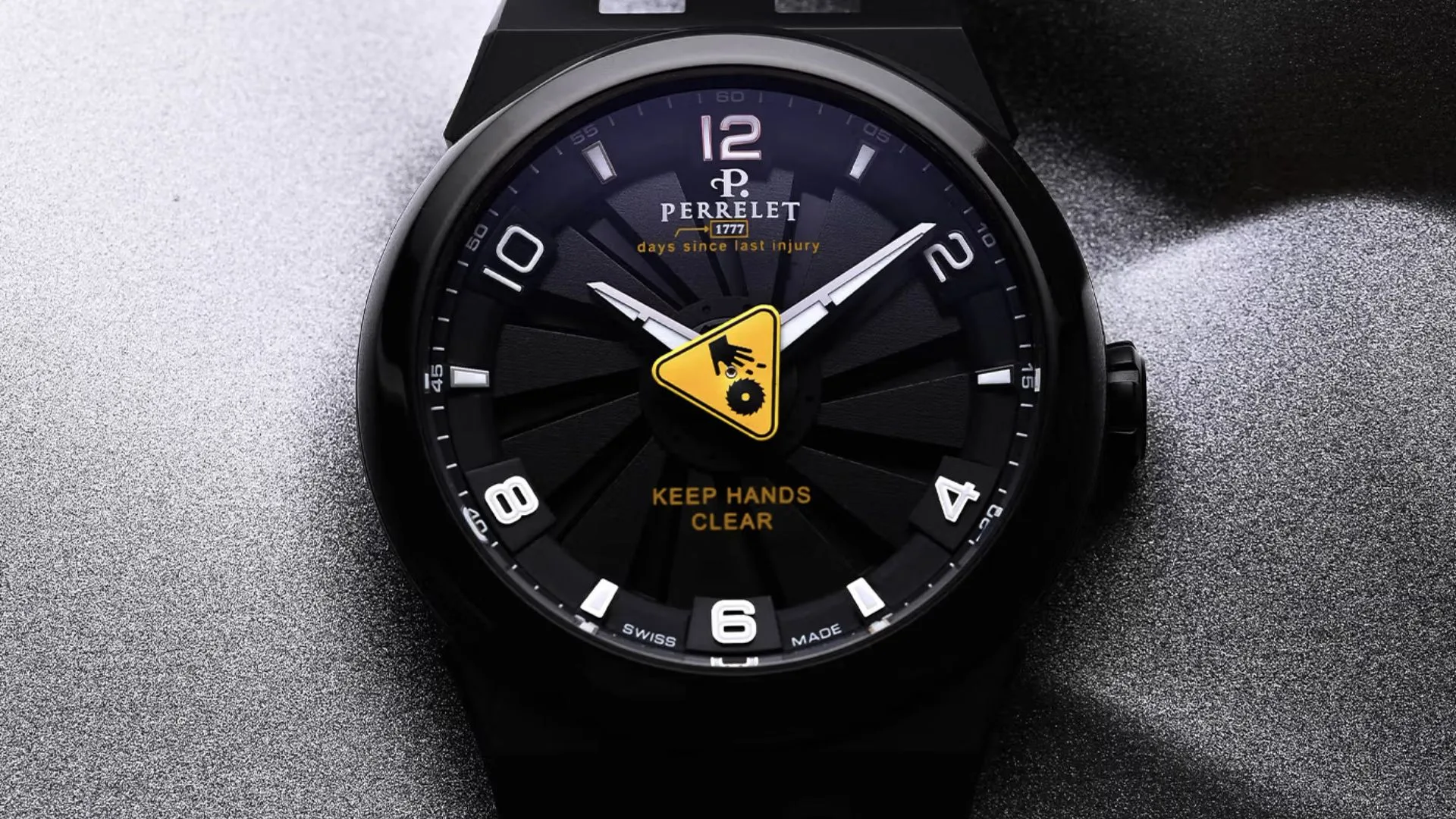 A bright yellow inscription that reads “1777” is located directly beneath the Perrelet logo and “days since last injury” – a tongue-in-cheek nod to the typical “Safety First” signs as seen in factories.