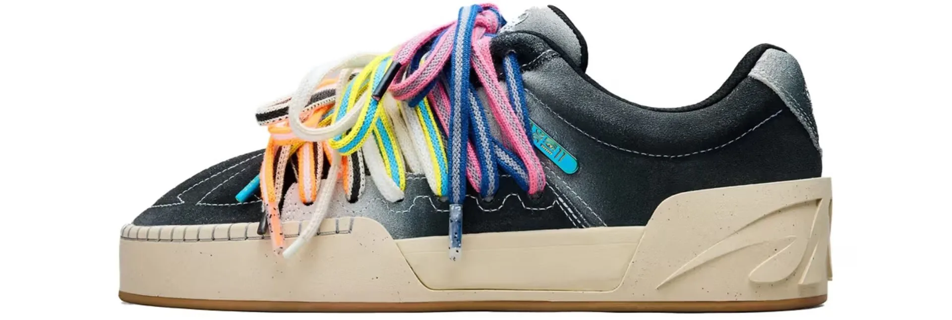The low-top silhouette is crafted from breathable split cow suede leather, enhanced with detailed embroidery, moccasin-inspired fringes and vibrant laces for a touch of individuality.