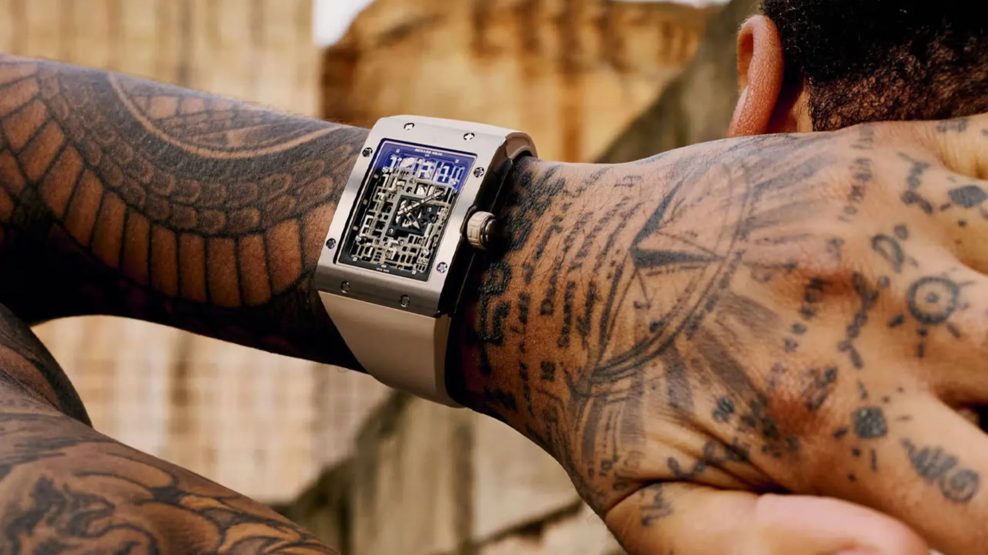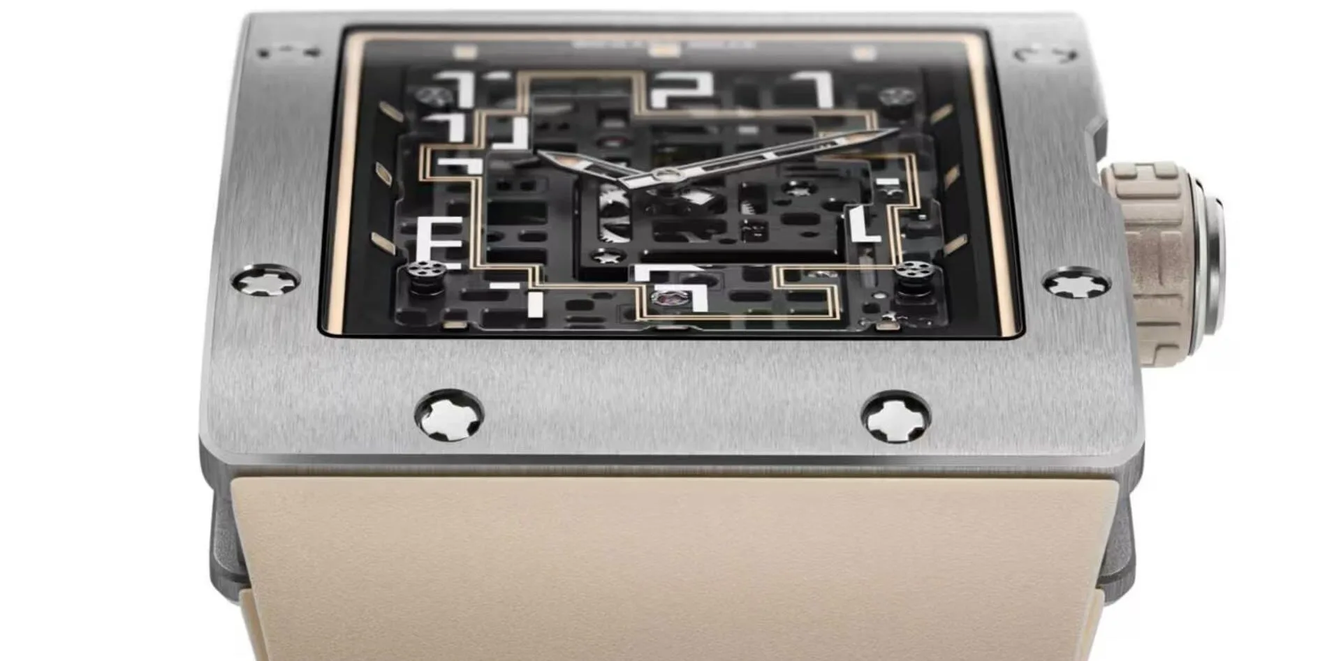 The RM 16-02 reimagines Richard Mille’s signature style with a rectangular, monolithic design that embodies brutalist architecture. Its clean, geometric lines provide elegance, while the skeletonised CRMA9 in-house movement, crafted from grade 5 titanium, reveals the intricate engineering beneath its surface. The movement features meticulously chamfered apertures that maximise light flow, highlighting the artistry of its construction.