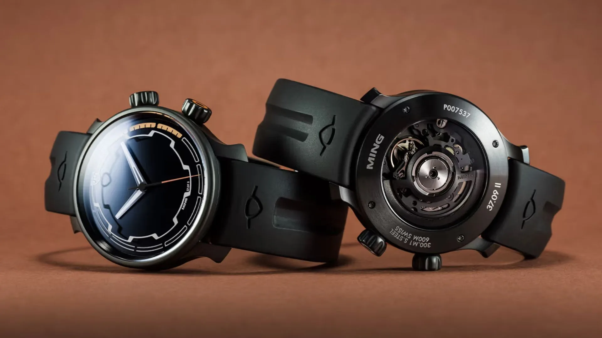 With a power reserve of roughly 50 hours at full wind, the Sellita for MING SW300.M1 automatic movement, which beats at its core, guarantees the best performance and dependability. The watch is accompanied by a moulded FKM rubber band that is waterproof and secure to wear thanks to a DLC-coated flying blade tuck buckle.
