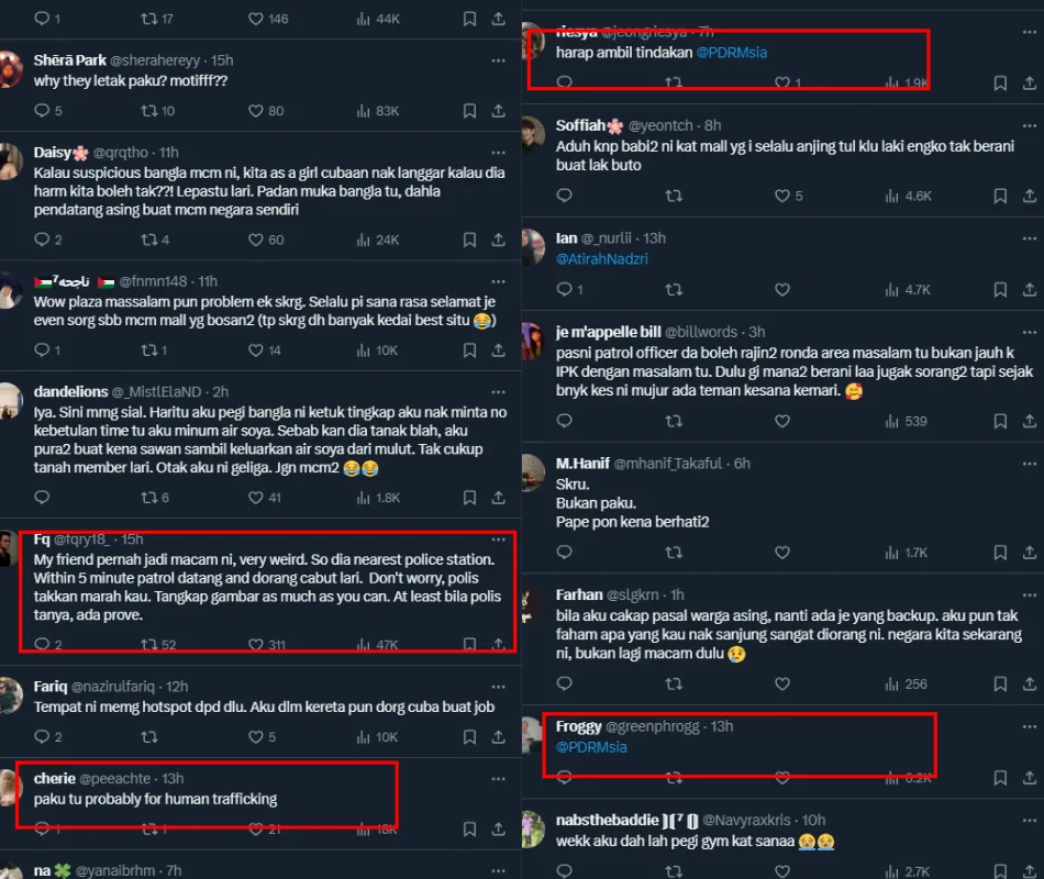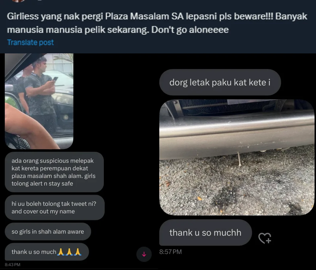 Many were shocked that the incident happened at a well-known mall in Shah Alam and tagged the Royal Malaysian Police (PDRM) to look into the situation. Others suspected that the suspicious men, believed to be foreigners, maybe human traffickers and that nailing screws to people’s cars was their way of marking their next victim.