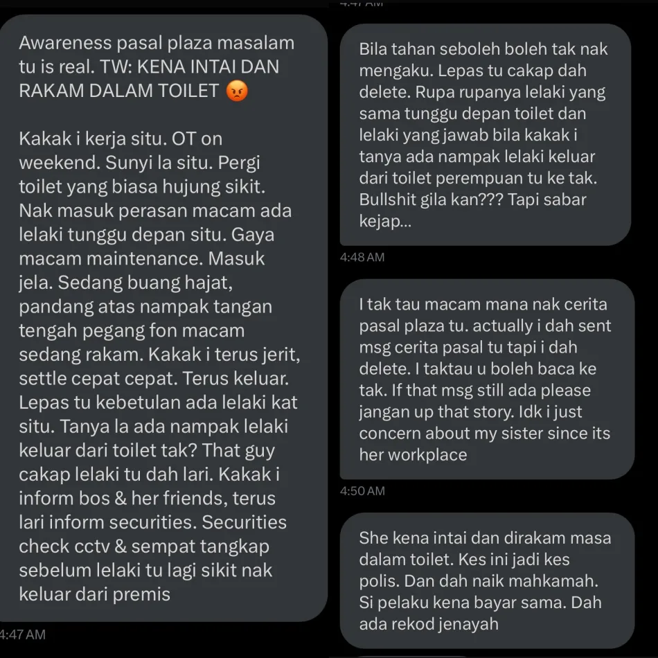 Unfortunately, that wasn’t the only terrifying incident that happened there. @/adlinakml tweeted another DM she received from someone who claimed that her sister was being spied on in the restroom. In the message, the unnamed user said that her sister, who works at Plaza Masalam Tower, was using the restroom when she suddenly noticed a hand holding a phone from above.