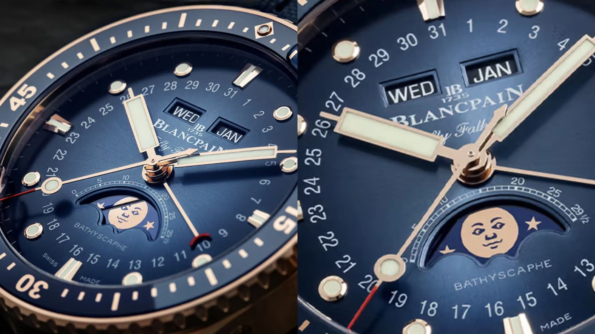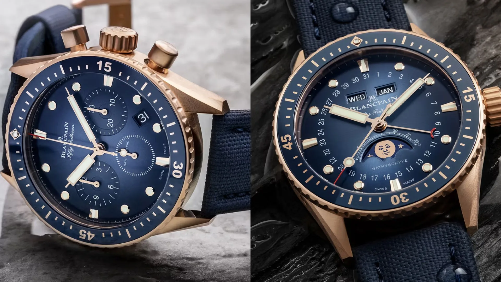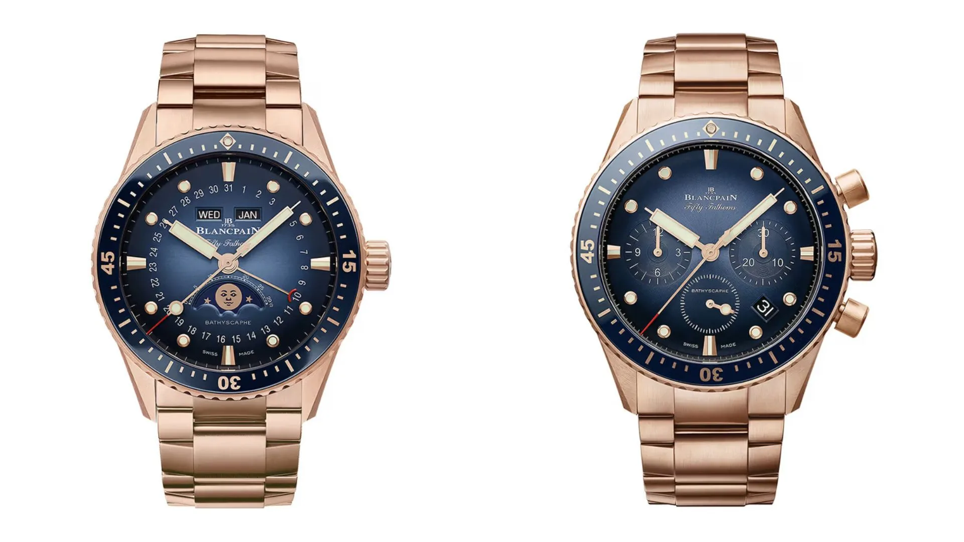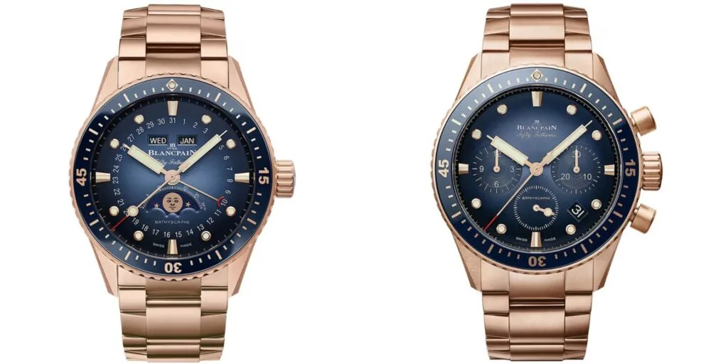 Blancpain presently offers the pair of red gold Fifty Fathoms Bathyscaphe timepieces. Visit the official website for more information.