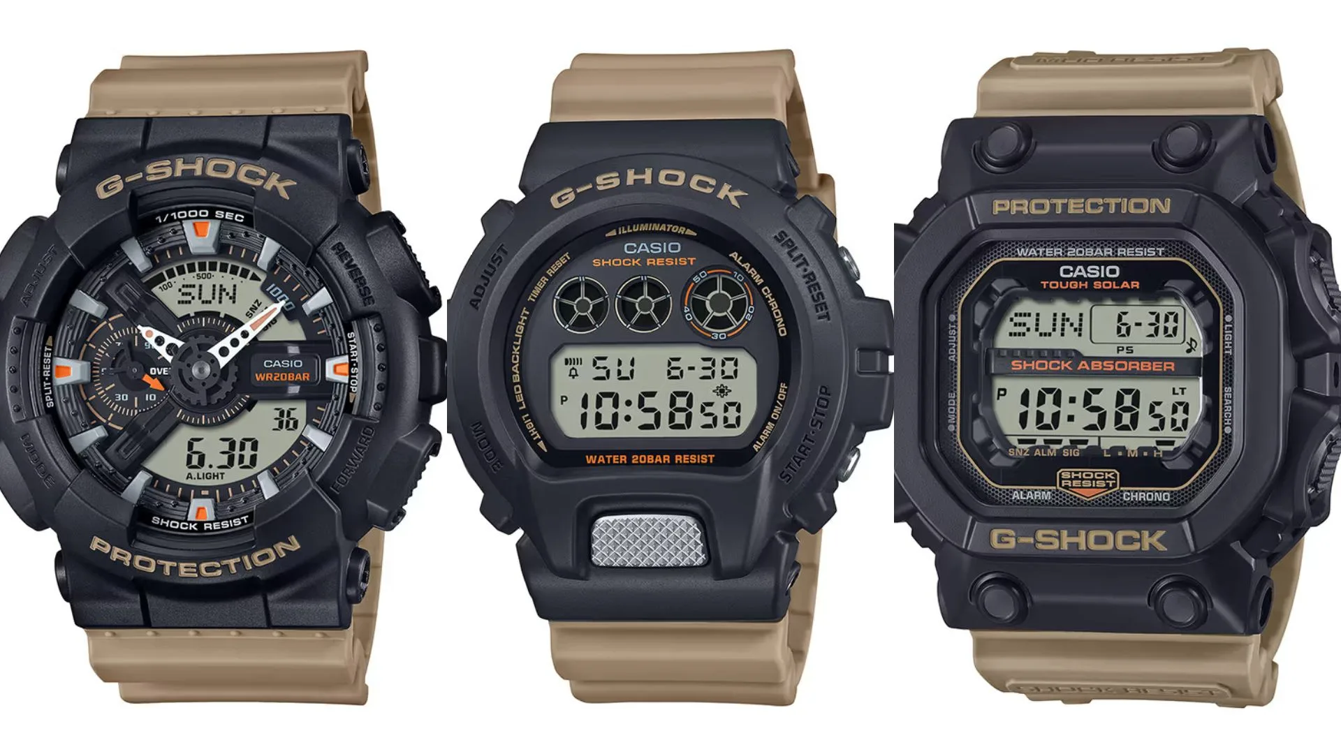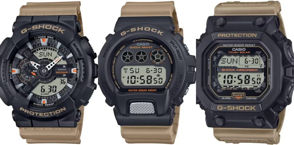 The beige accents and bands are incorporated into the GA110TU-1A5, DW6900TU-1A5, and GX56TU-1A5 models from the lineup.