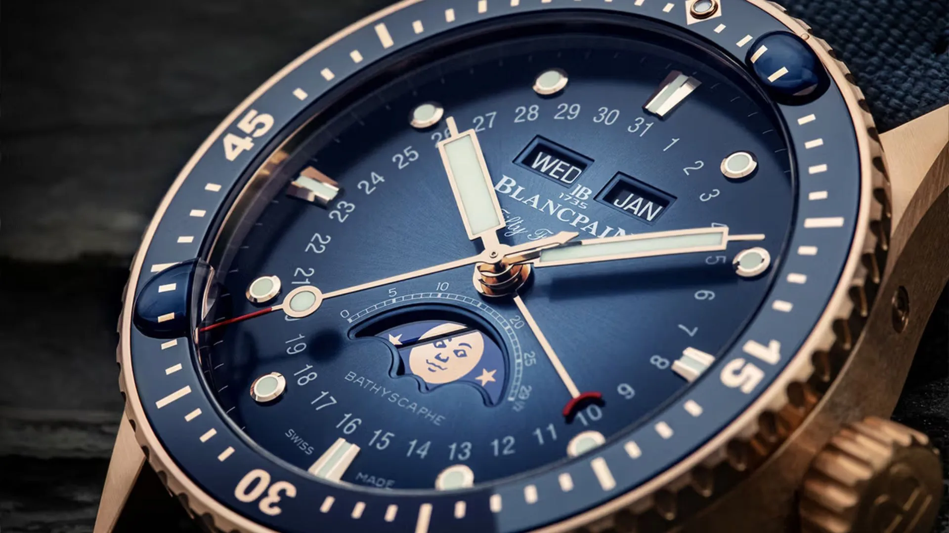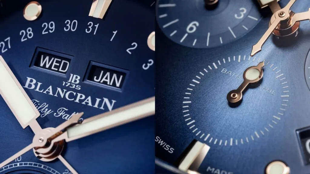 The diver indices and the boxy, syringe-style handset on the dial are adorned with ceragold, which gives the components the vital luminosity they need in low light. The new references live up to the Fifty Fathoms moniker by being waterproof to 30 ATM.