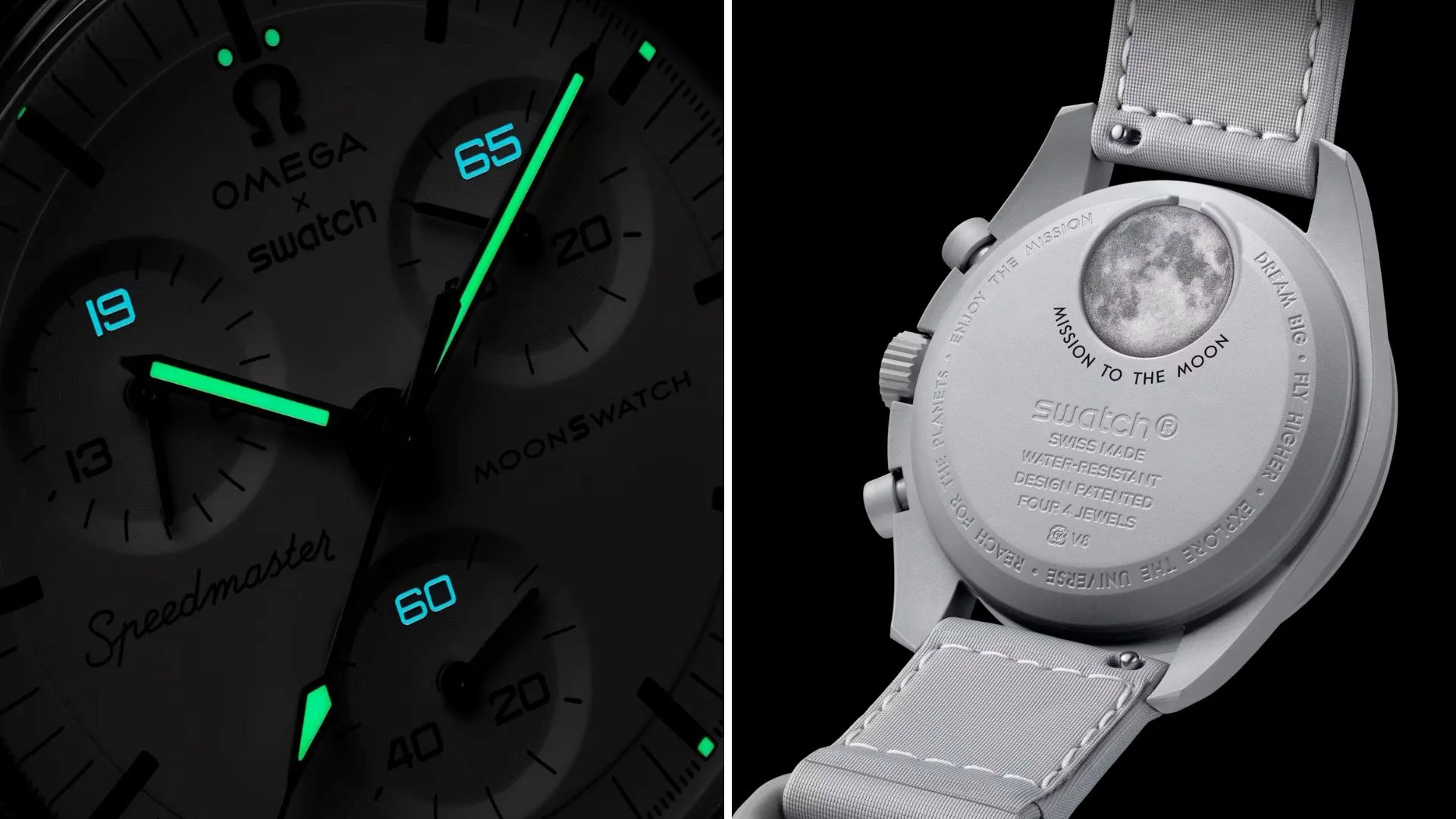 The coolest detail? Under UV light, the chronograph counters glow in blue Super-LumiNova, displaying 19 and 65 as a nod to the year 1965 and the 60th anniversary. Plus, the movement inside has been modified to count 19 hours and 65 minutes, making it one of the most unique MoonSwatches yet.