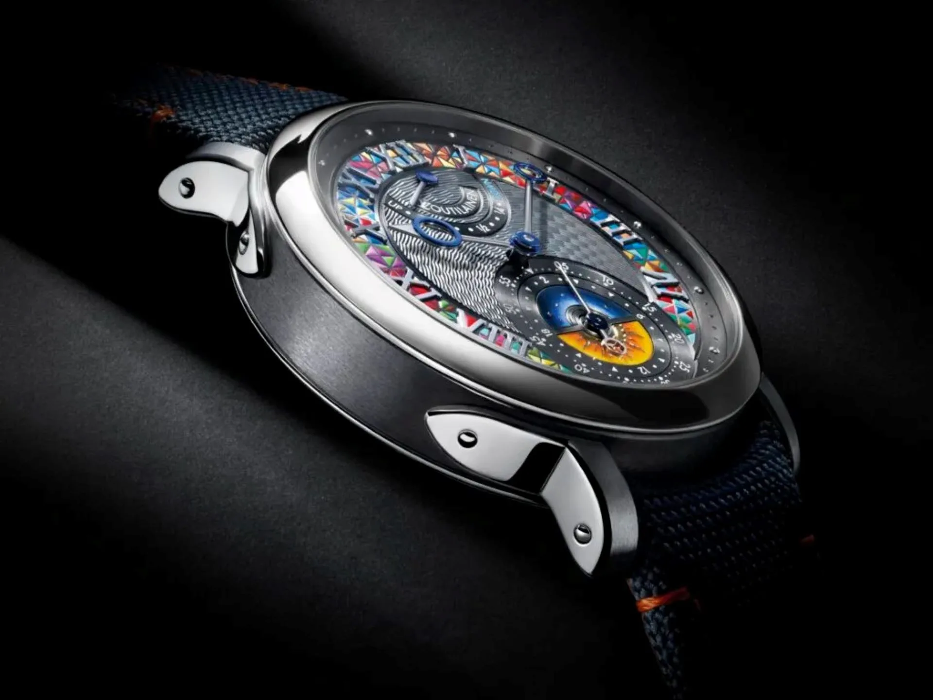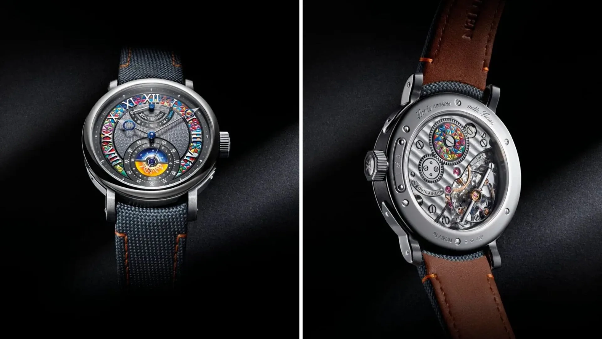 The gold dial blends both brands’ artistry, featuring a diamond-polished hour circle by Maryna Bossy and hand-guilloché detailing. It includes miniature painting, engraving, and enamel work with a day/night disc in Louis Vuitton’s signature saffron and blue. A hidden Monogram flower in the enamel adds a refined touch of elegance.