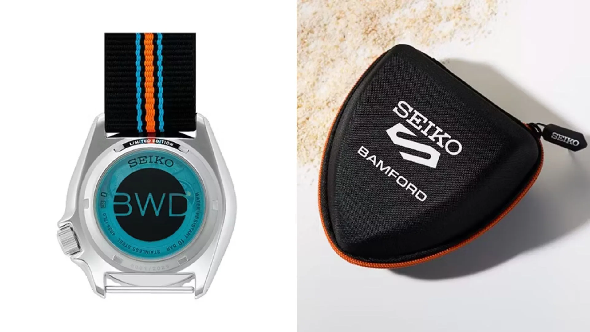 The SBSA315 truly shines in the dark with LumiBrite on the hands, markers, and even the day disc. Its black-and-blue NATO strap with a bold orange stripe adds to the glow, while the dependable 4R36 automatic movement keeps it running with 41 hours of power reserve. Limited to just 2,025 pieces, this collab is both fun and functional, showcasing Seiko 5 Sports with Bamford’s signature twist.