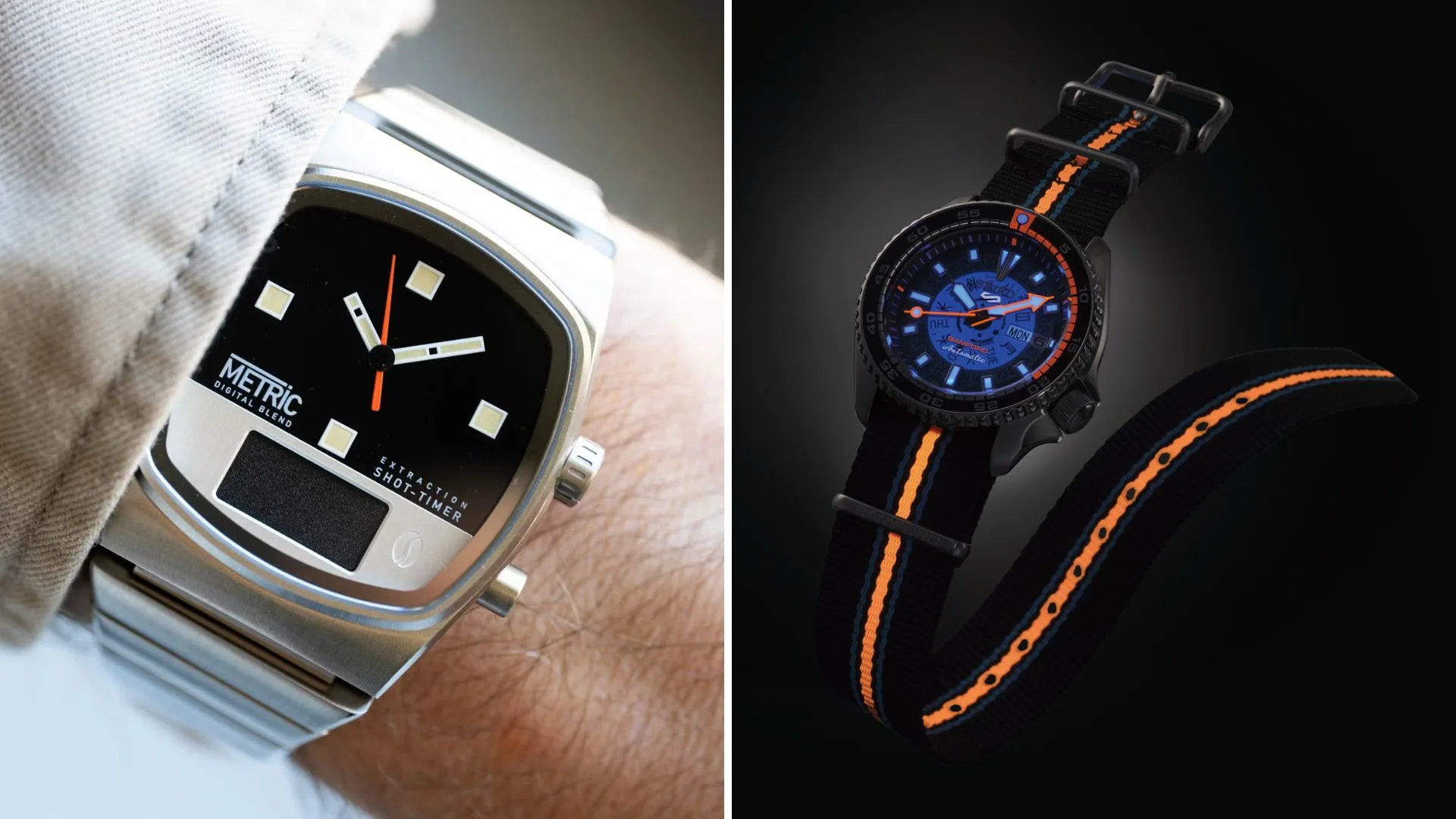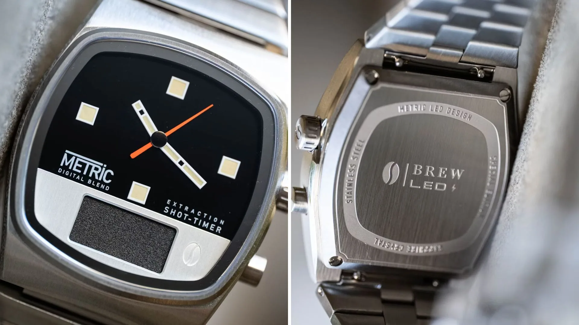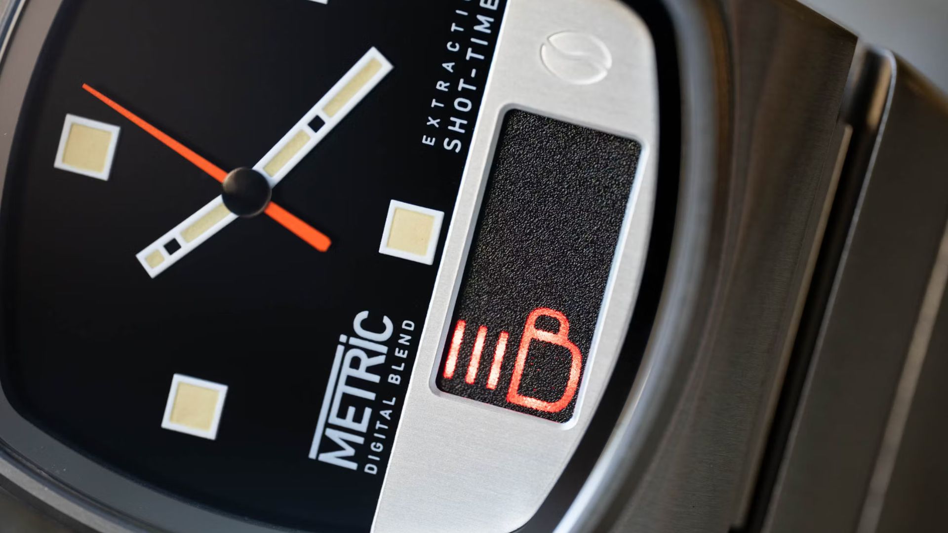 Brew Watch Co. has always brewed up quirky designs, but this one might be their boldest experiment yet. The new Metric Digital Blend is part wristwatch, part espresso timer, and 100% conversation starter. It takes Brew’s retro cushion-shaped Metric case and gives it a hybrid twist—an analog dial up top, and a hidden LED timer at the bottom for your perfect coffee pull.