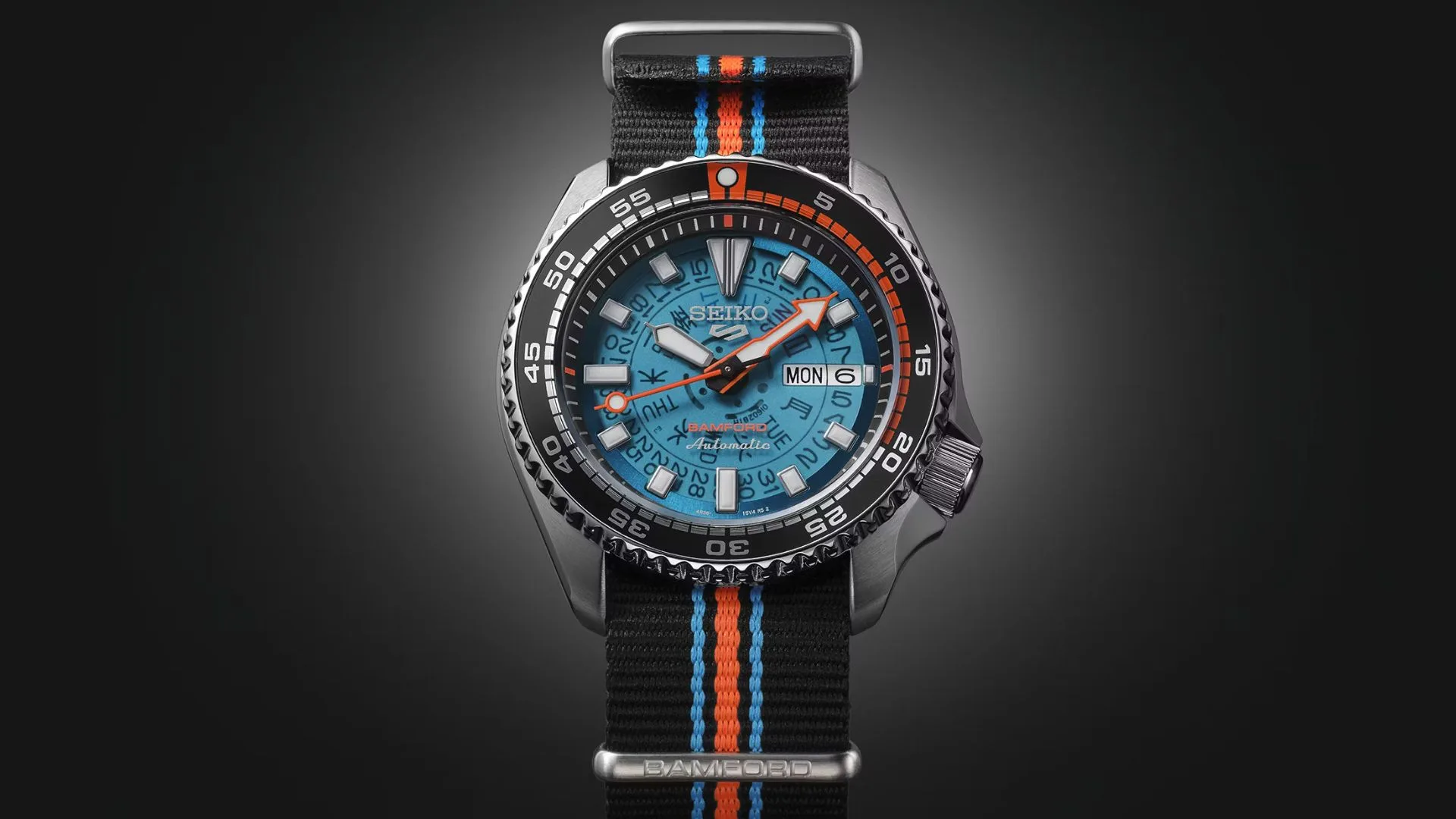 At first glance, the translucent blue dial sets the tone, giving you a peek at the bilingual day and date wheels spinning beneath. The silver-and-orange handset, luminous markers, and that cheeky orange-tipped dive bezel nod straight to Seiko’s 1980s SKX era. Add in a curved Hardlex crystal and a Bamford-signed display back, and you’ve got a piece that balances nostalgia with fresh, collectible energy.