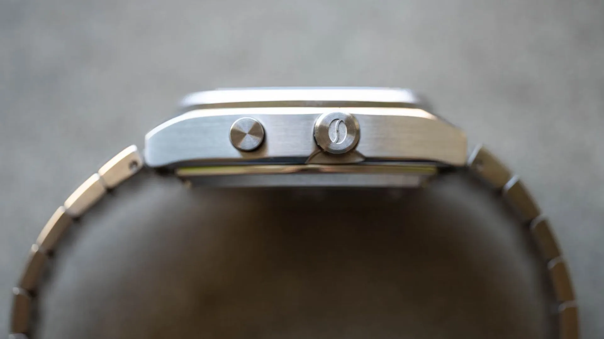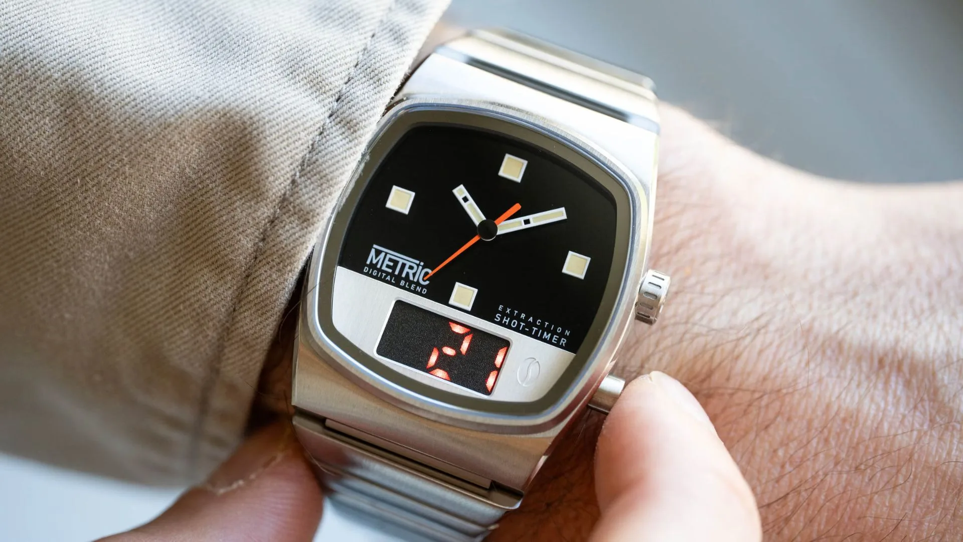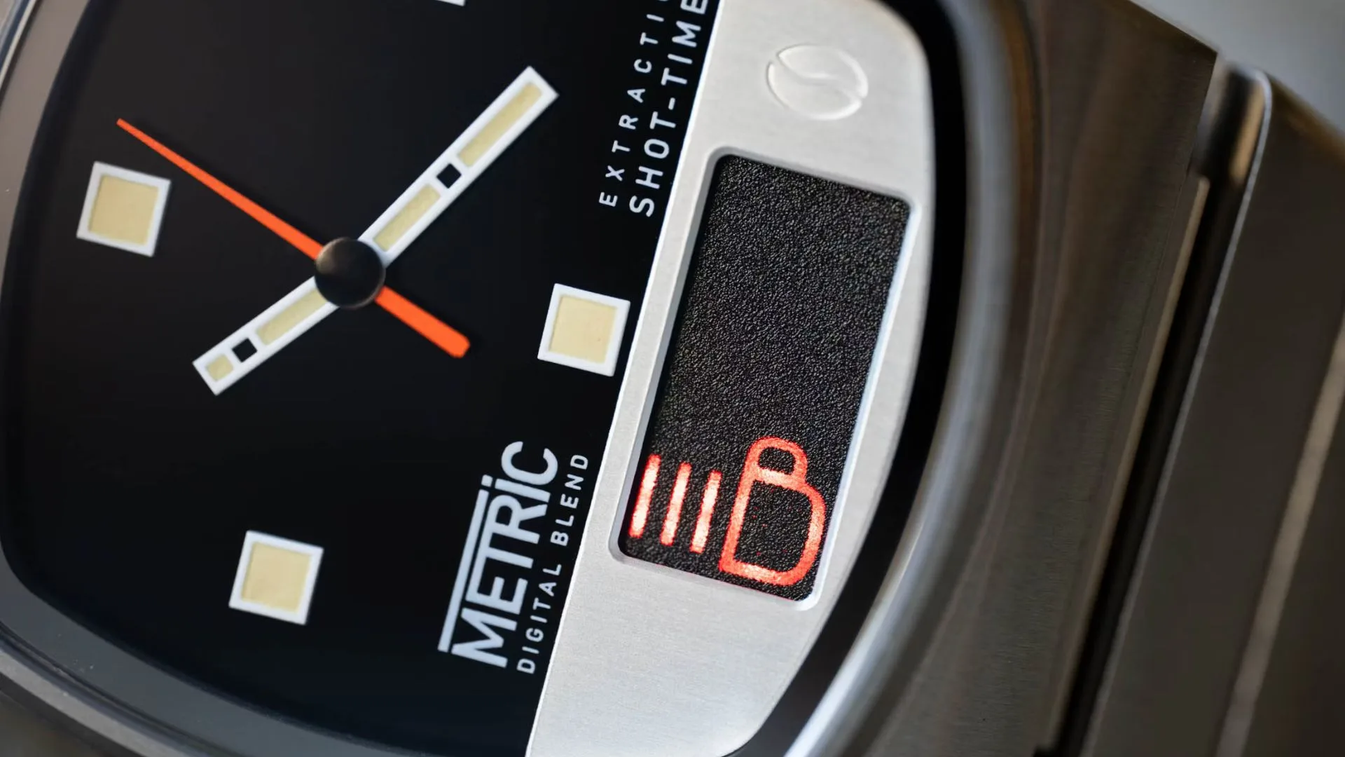 On the wrist, the watch channels ‘70s vibes with a glossy black dial, bold square markers, rectangular hands, and a pop of orange on the seconds hand. The lower section looks like brushed steel at first, but press the pusher and a hidden digital screen comes alive with a 30-second countdown. Once it hits zero, a steaming coffee animation appears—fun, cheeky, and surprisingly handy if you’re into espresso.