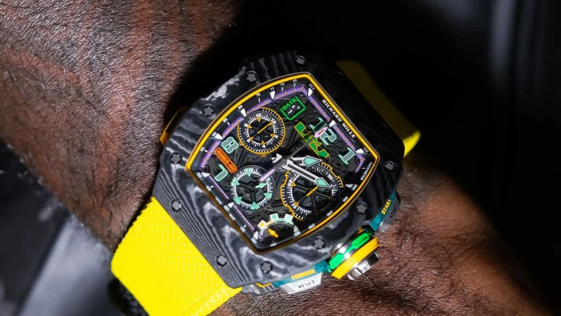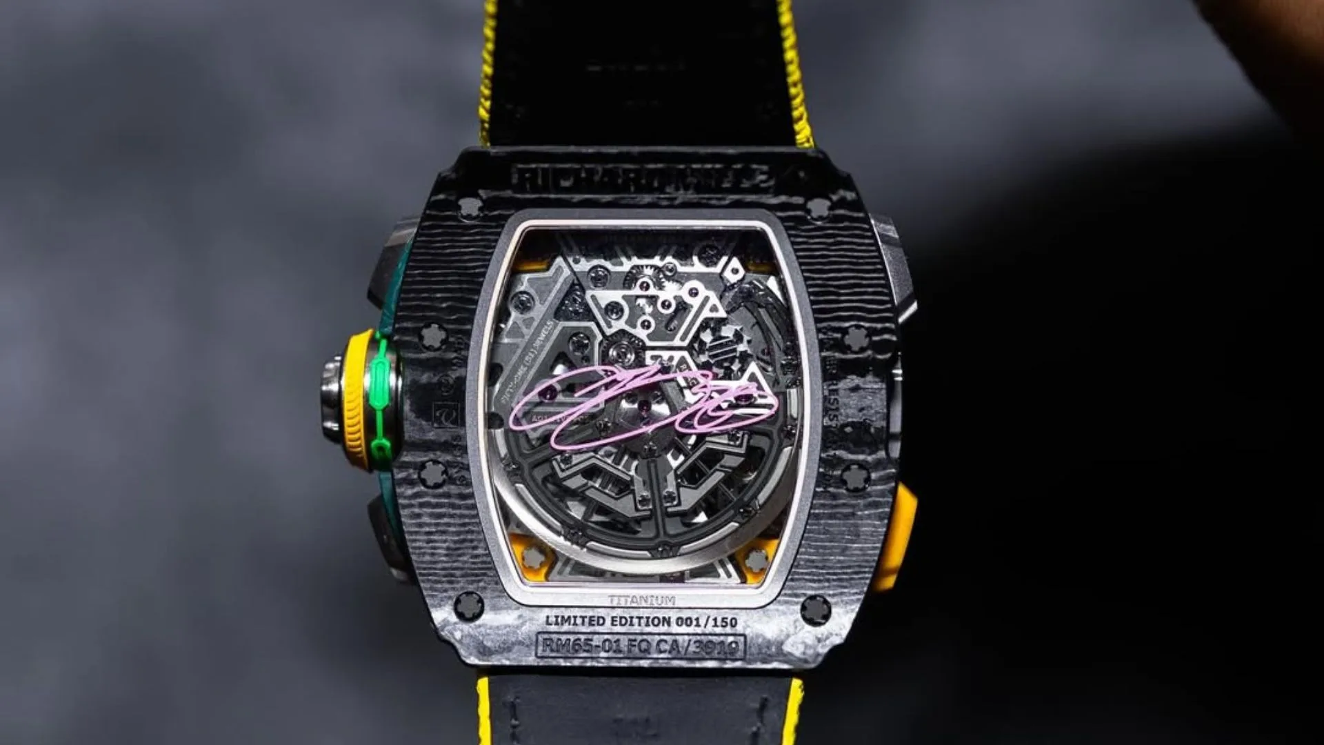 A yellow Quartz TPT middle case with green accents and a unique purple hour marker ring contrast with the case’s sleek black textured material.