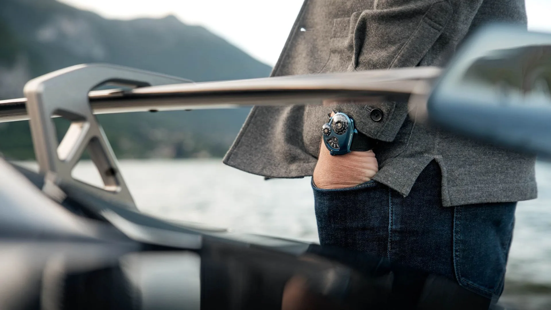 The watch is made of Grade 5 titanium, which was selected for its strength and light weight. It’s finished with a variety of sandblasted, brushed, and polished textures that experiment with form and light.