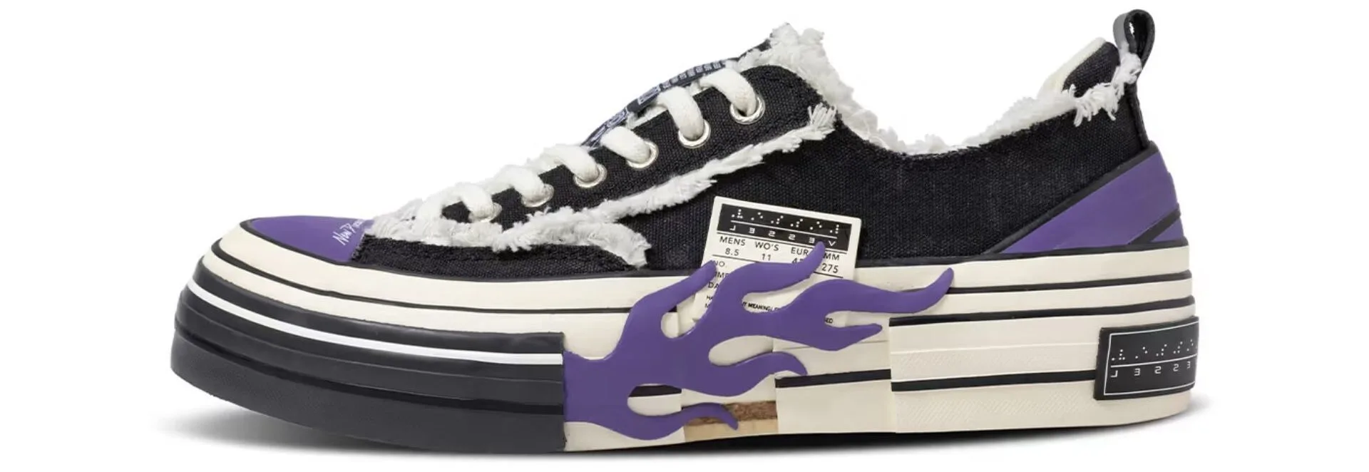 However, the main attraction is the bold violet rubber that adds a splash of colour on the toe cap, heels, and the side of the shoe; the last among the three is particularly daring as it comes in hotrod flames. This naturally culminates in xVESSEL’s unconventional design language that always features a hybrid look, that will undoubtedly be the talk of the streets.