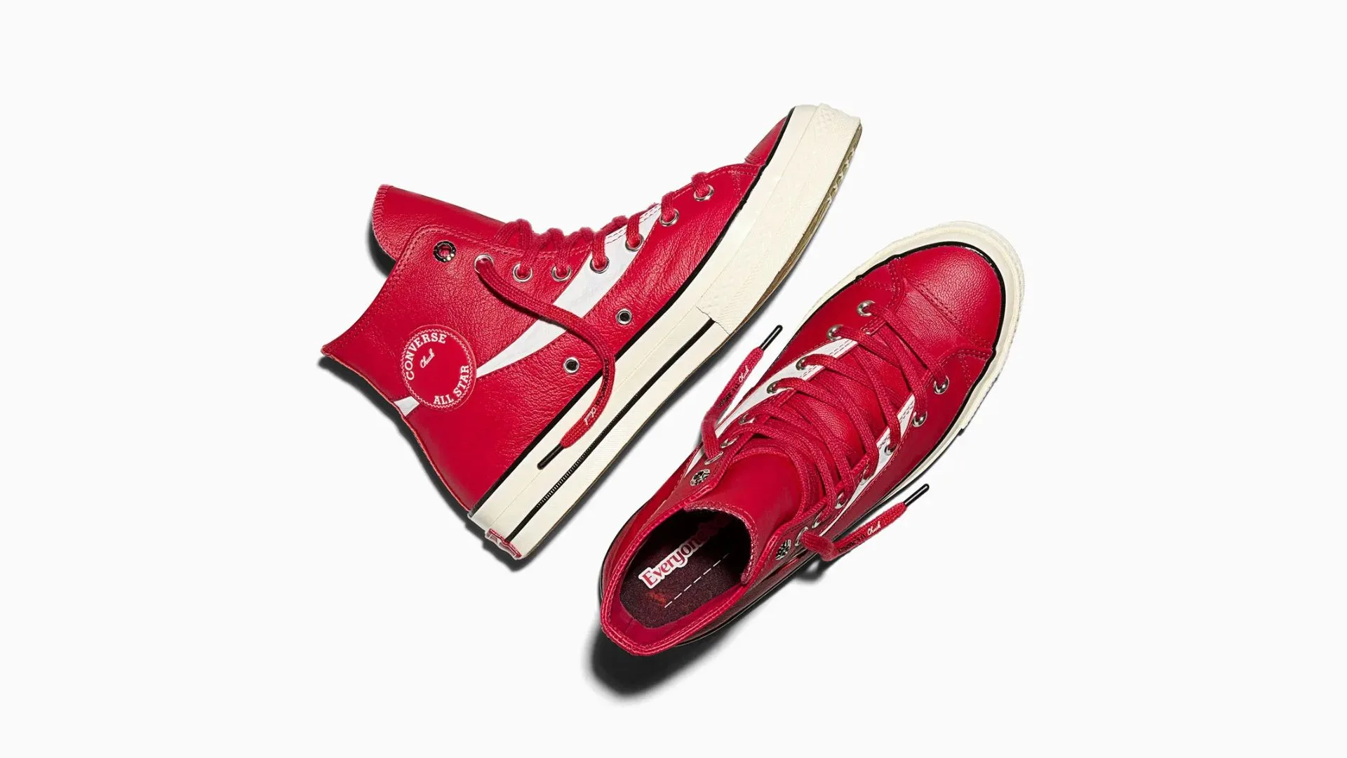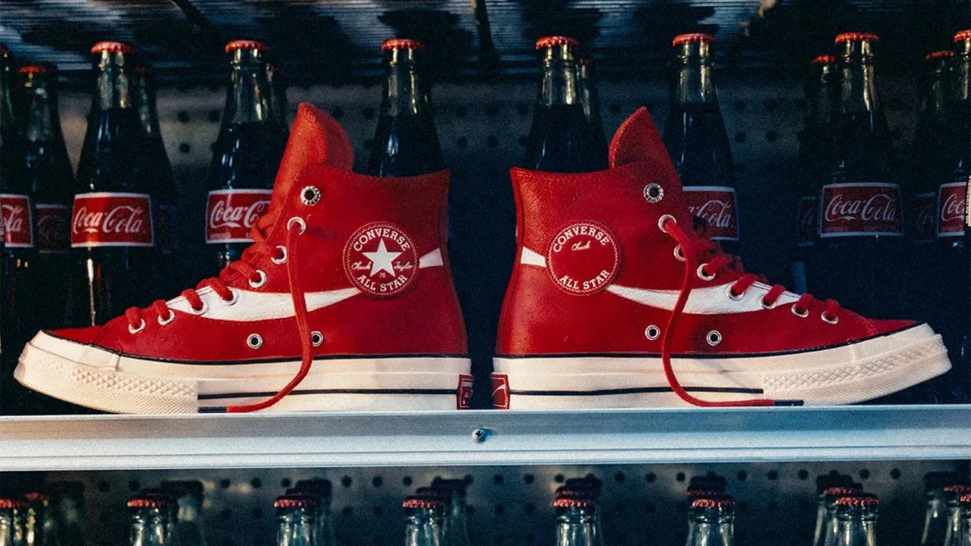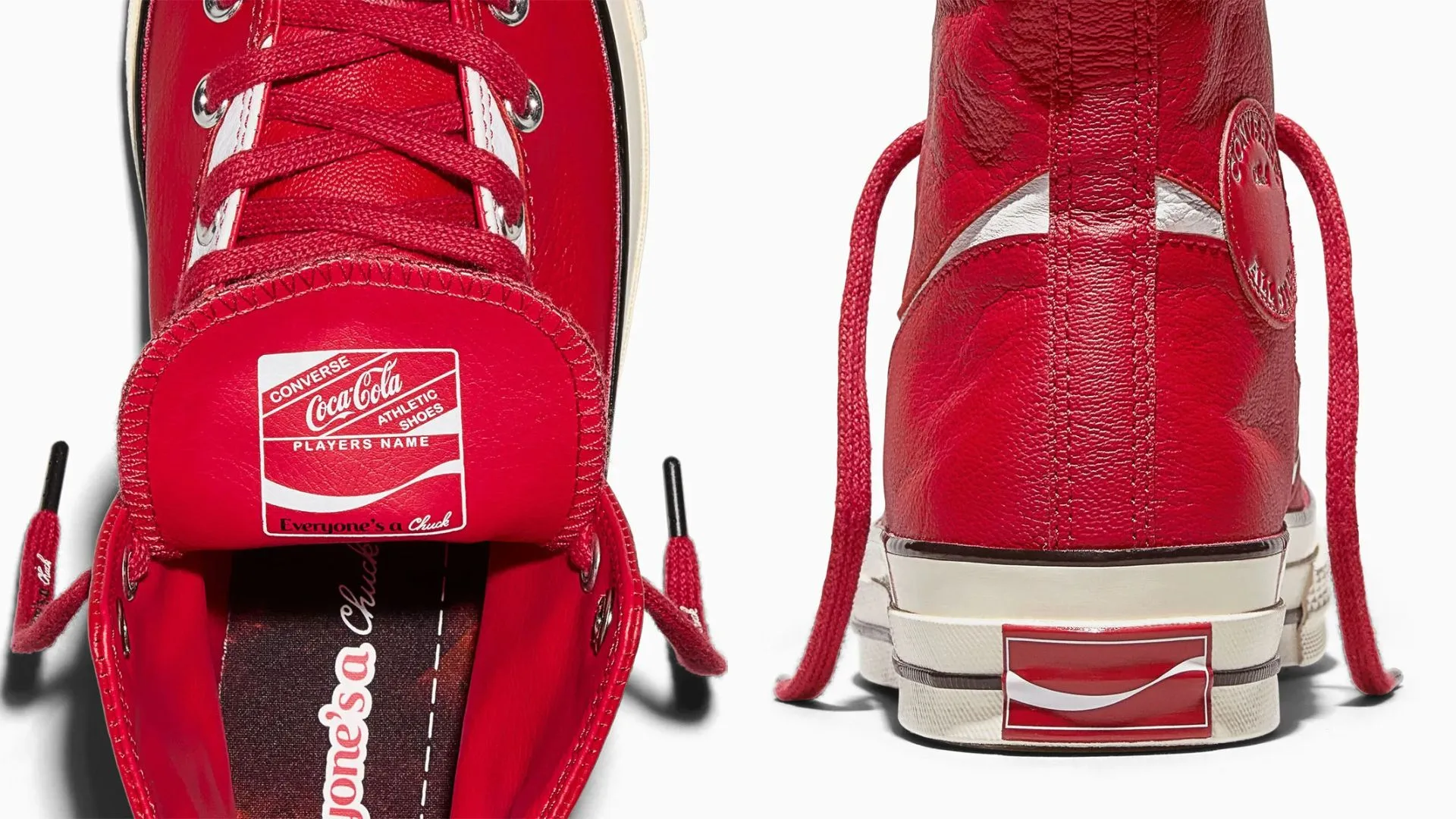 The new collection features three leather Chuck 70s in red, black, and white. Each pair highlights Coca-Cola’s famous script logo, stitched as an extra panel that wraps around the heel and lower eyelets. The translucent green outsole subtly nods to Coke bottles, while metallic eyelets and co-branded insoles add that extra pop of detail. Look closely and you’ll find playful touches like bottle-cap motifs and spots for personalisation on the insole and tongue.