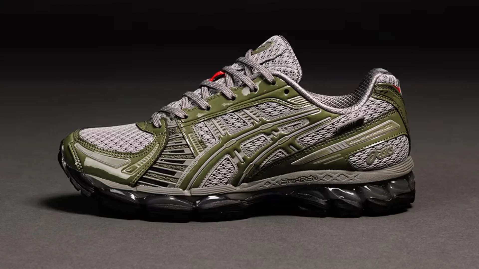The design combines a grey mesh base with reflective olive patent leather overlays, creating a sleek and understated look. Red accents appear on the tongue and outsole for a subtle pop of contrast, while the signature UP THERE branding appears reversed on the heel. The vibrant gren insoles add a final touch that ties the whole palette together.