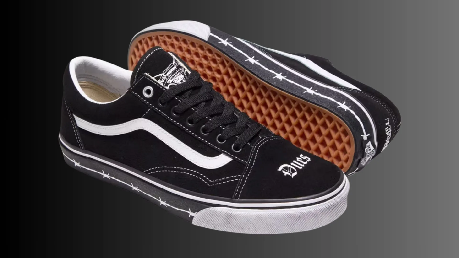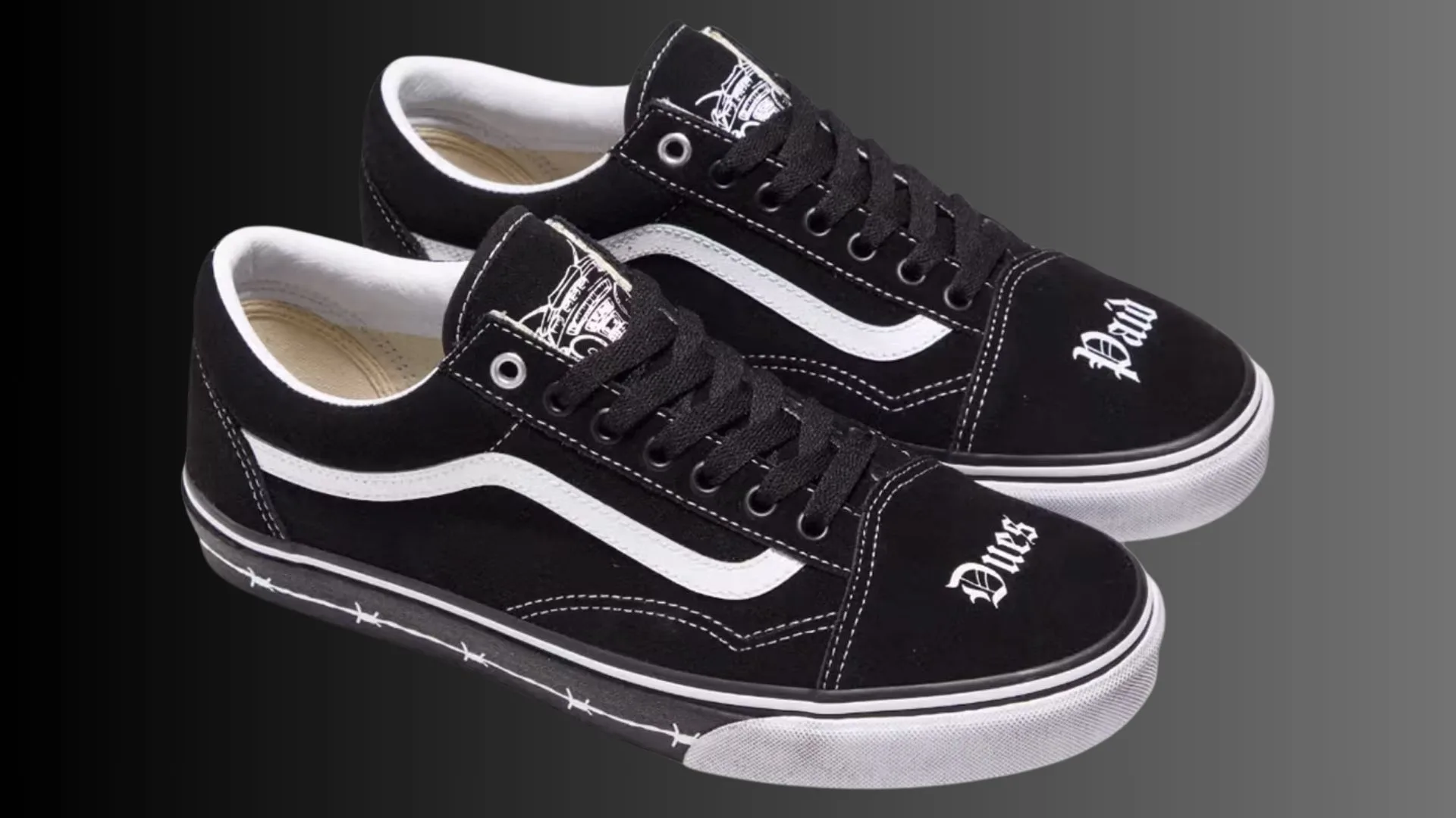 Dressed in timeless black and white, the Travis Barker x Vans Old Skool captures the spirit of perseverance with a bold “Dues Paid” emblem front and center. The design goes hard on details—barbed-wire foxing wraps around the shoe, while Barker’s signature logo amps up the personality on the heel and tongue. It’s raw, unapologetic, and unmistakably Travis.