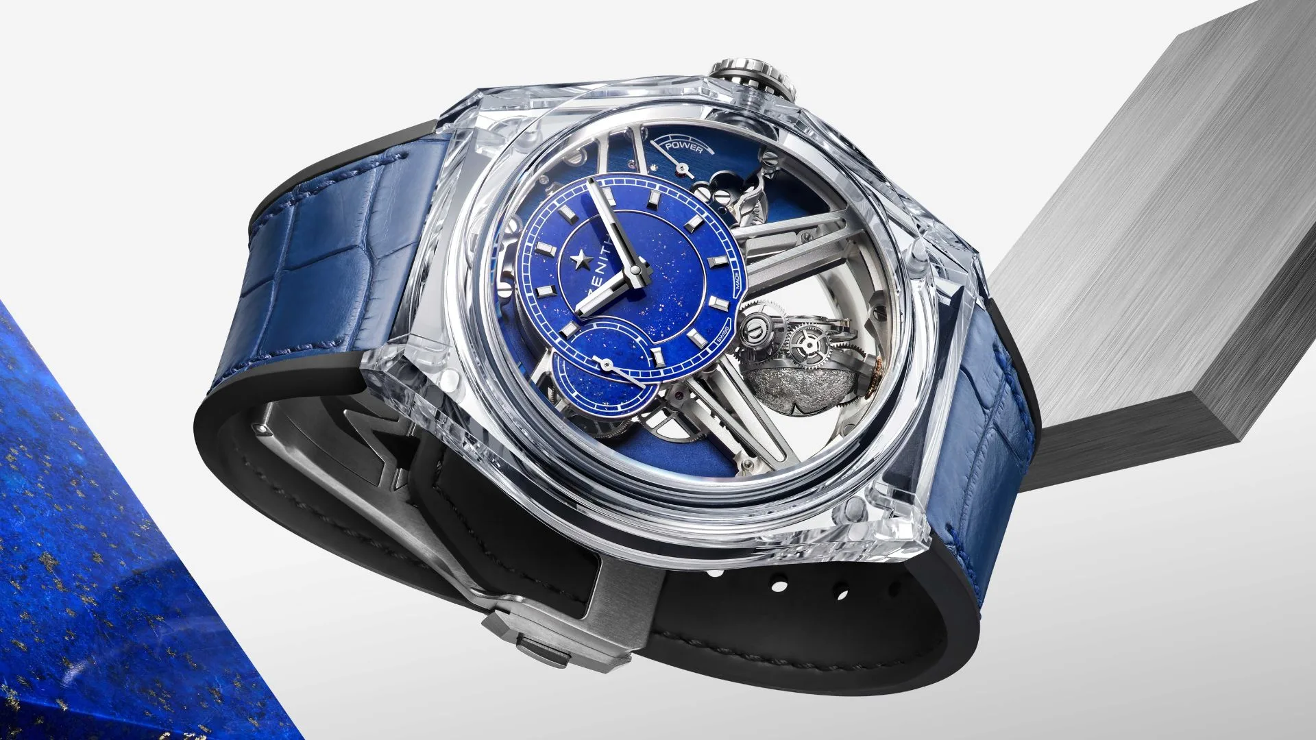 The Defy Zero G’s advanced technology is housed in a 46mm sapphire case, available in two versions—deep celestial blue or fully transparent sapphire. Its openworked dial showcases the El Primero 8812 movement, made from 139 finely crafted parts. The blue version features a lapis lazuli dial with gold-toned flecks that look like a starry sky, making each watch one of a kind. Details like the engraved counterweight and glowing markers add to its beauty, while the blue alligator strap gives it a sleek and modern finish.