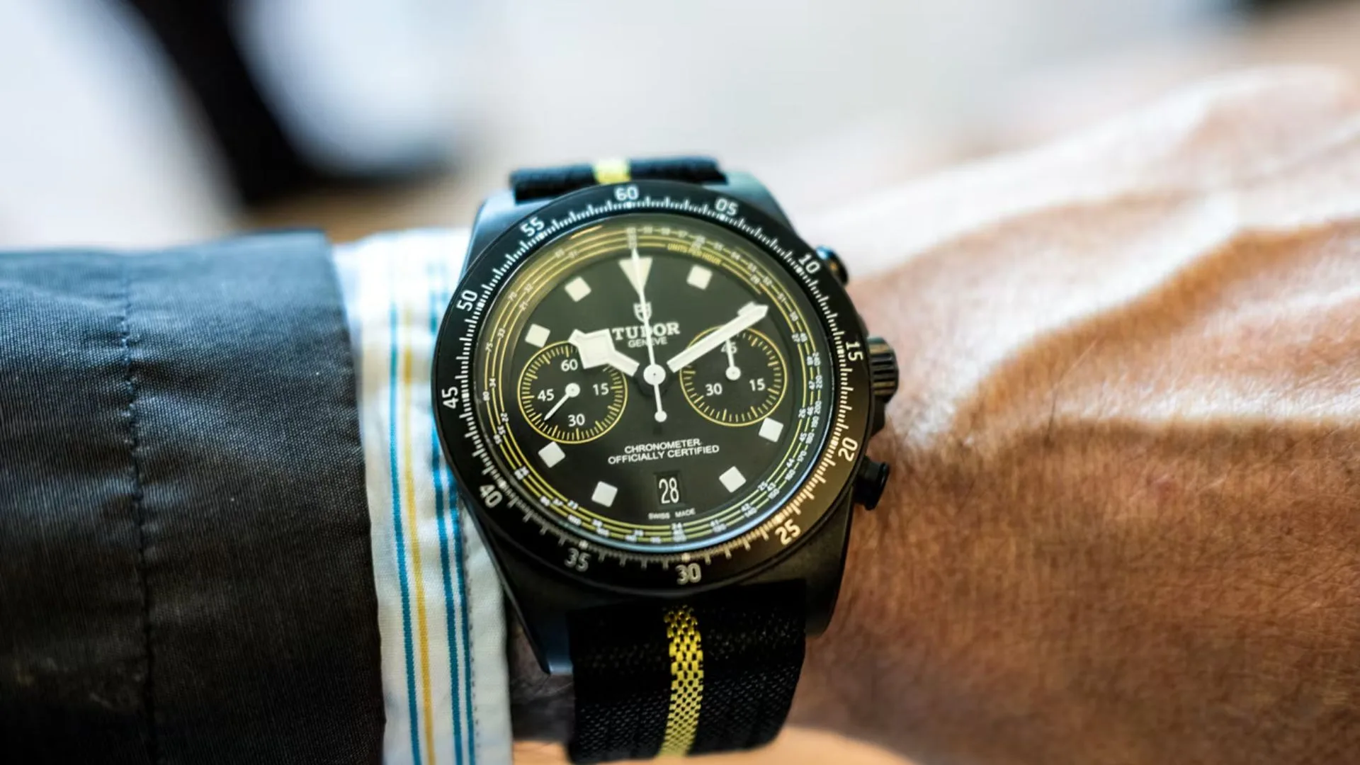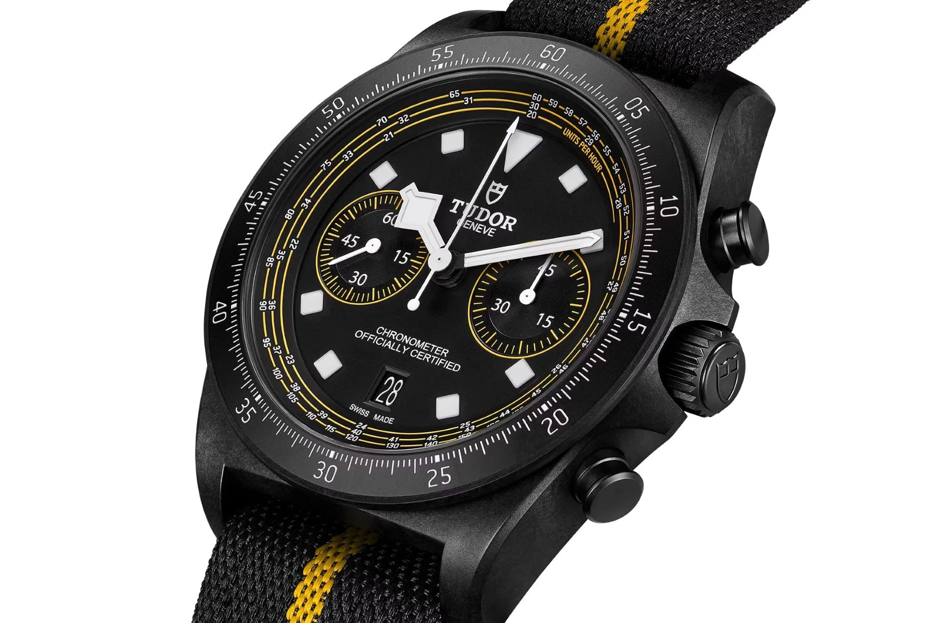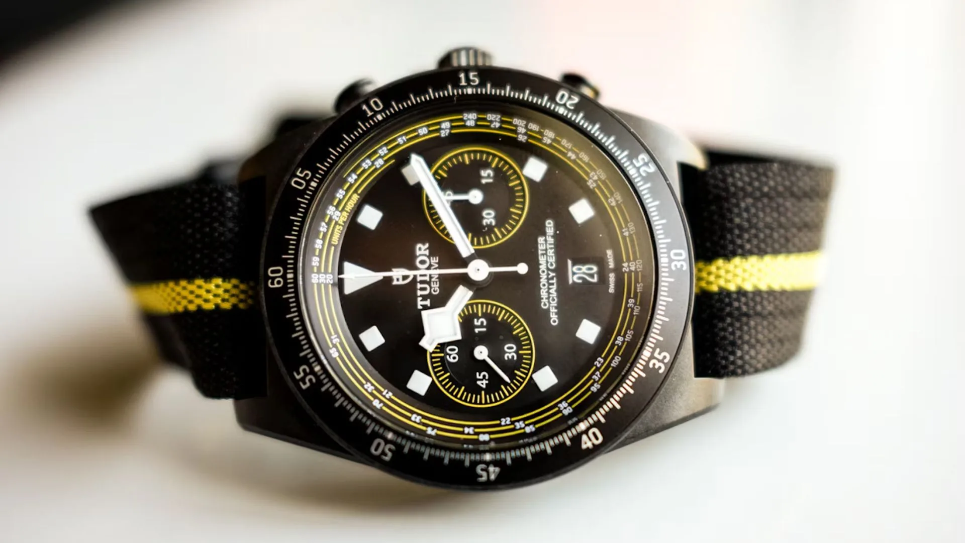 Under the hood is the COSC-certified MT5813 movement, offering approximately 70 hours of power reserve and automatic winding. The single-piece fabric strap, highlighted with a yellow stripe, completes the look with a nod to pro-level racing gear.