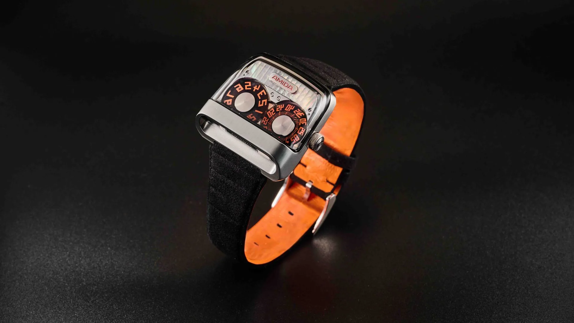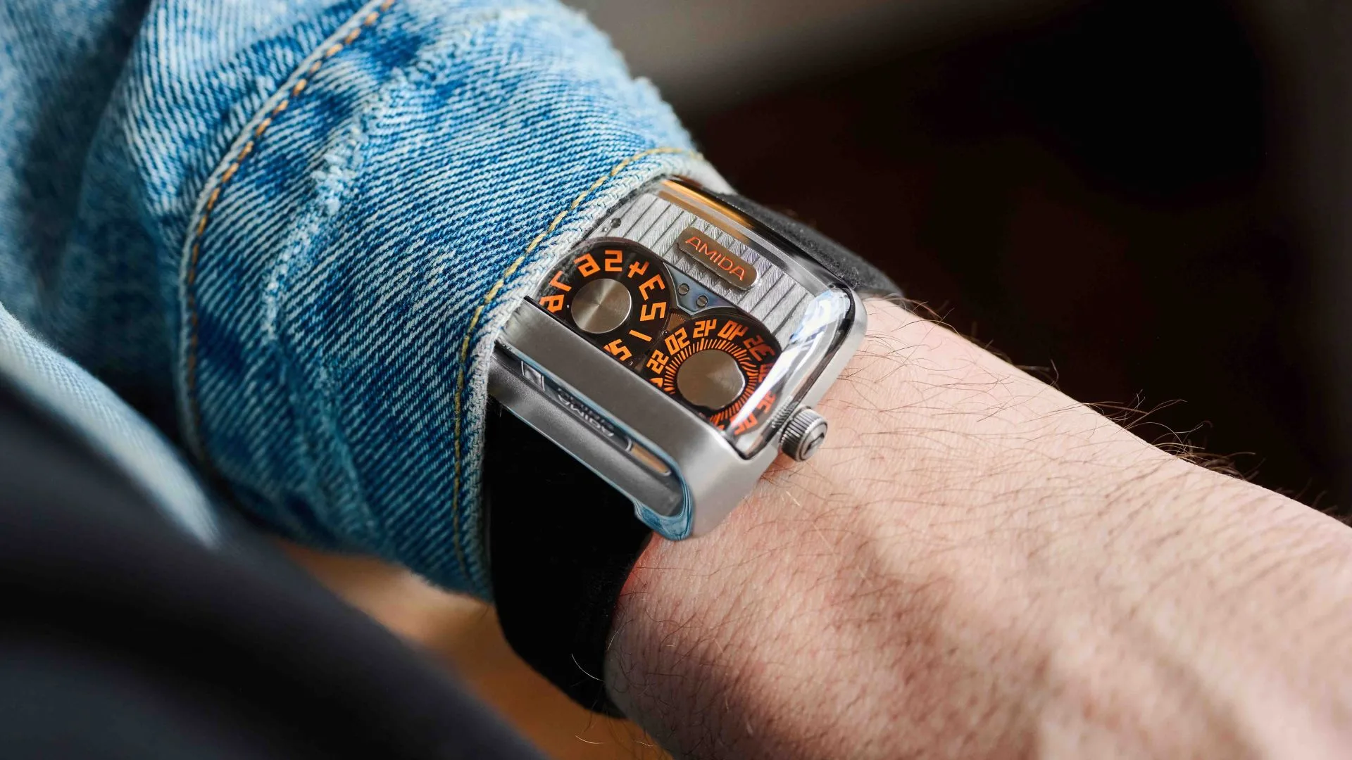 The numbers may appear reversed at first glance, but they flip into place via a clever prismatic display that reflects the time vertically, making it perfectly legible from a driver’s angle. With its 39.6mm by 39mm case and 16mm thickness, it wears surprisingly well on the wrist despite the visual drama.