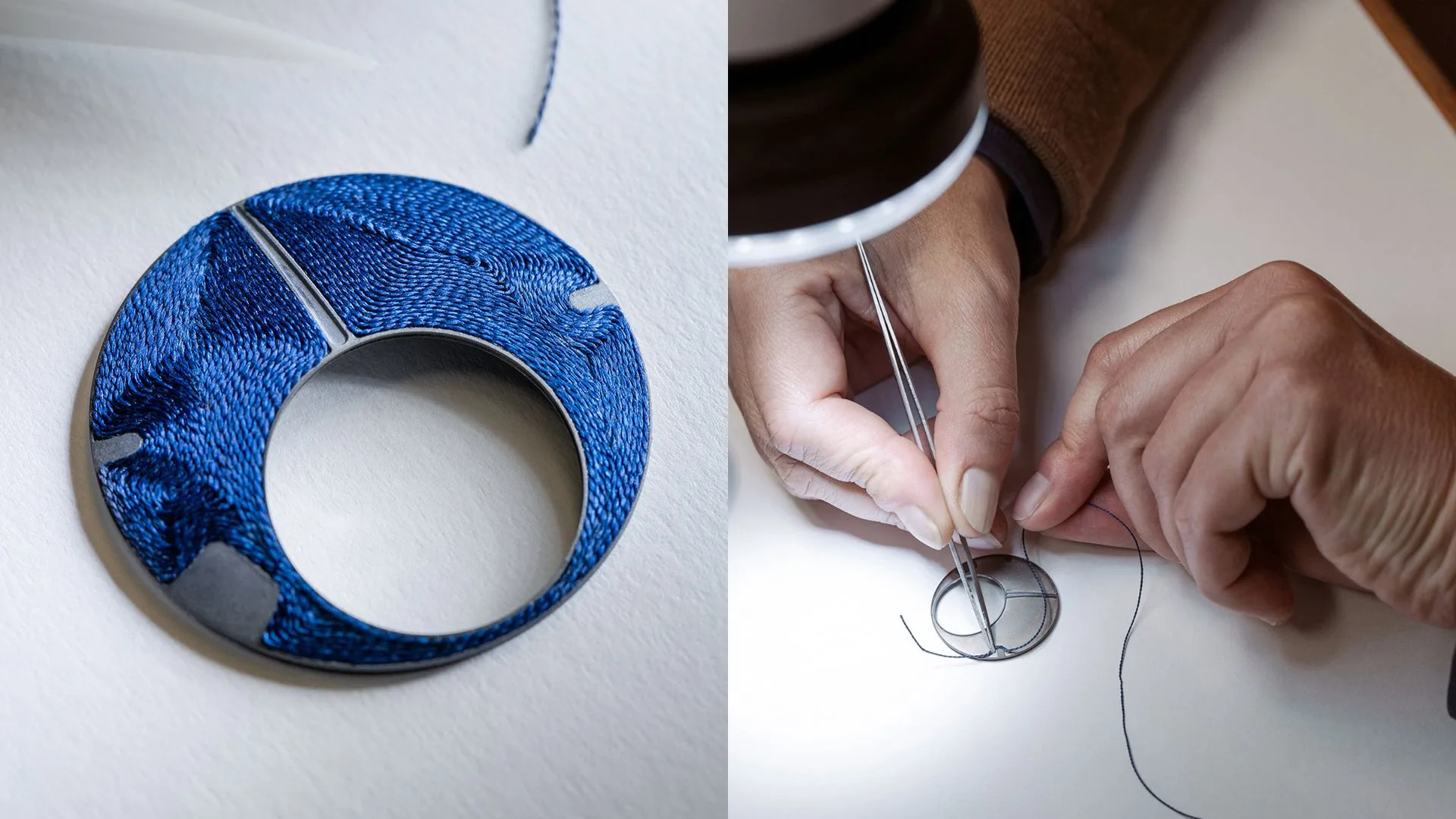 The result is a dial that exudes a distinct charm that is both structured yet organic, evoking elaborate embroidery. Thanks to the natural dyeing process, there is not a single uniform thread colour, creating a gradient-like effect that is unique to each individual piece.